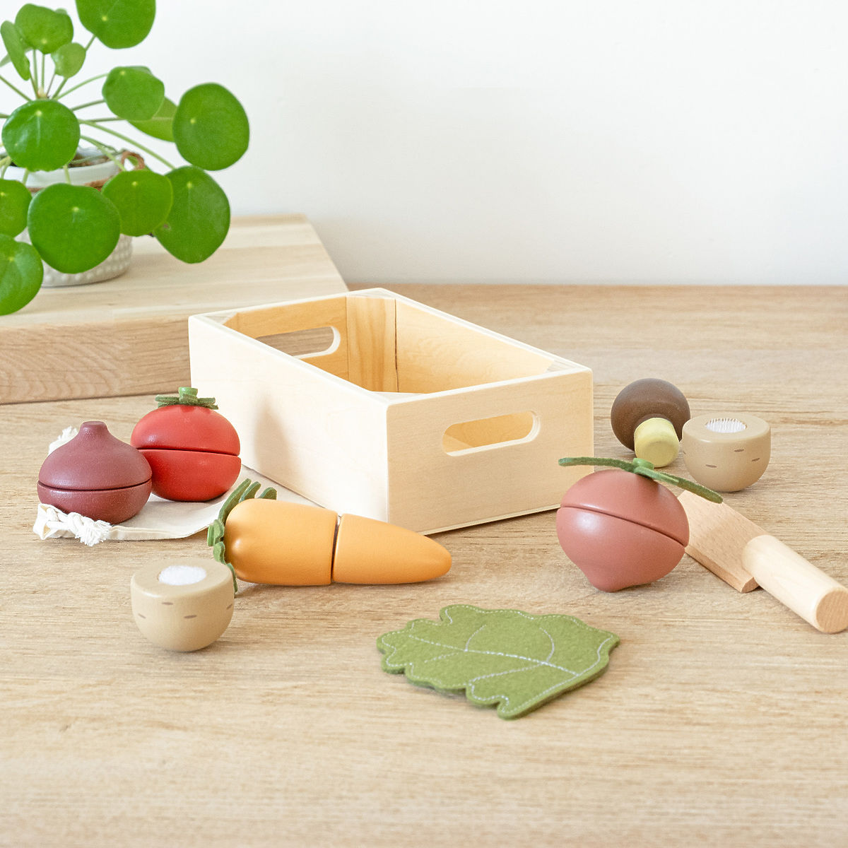 A kosárban egy kést és 7 db fából készült zöldséget talál - saláta, sárgarépa, burgonya, paradicsom, cékla, lilahagyma és gomba. A zöldségek egy részének levelei textilanyagból készültek, így még jobban hasonlítanak az igazi zöldségekre.