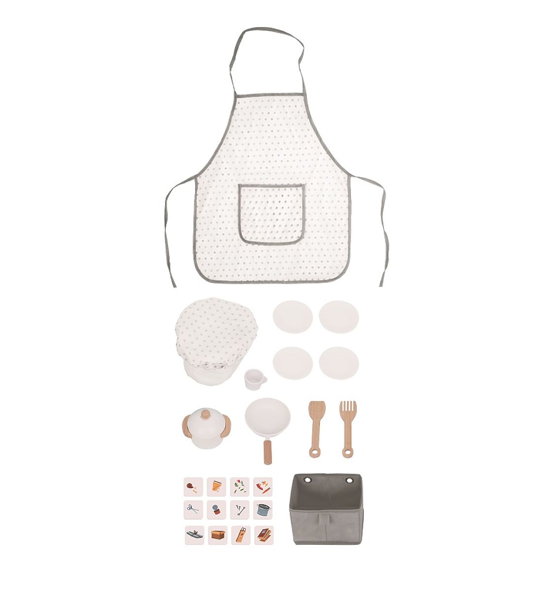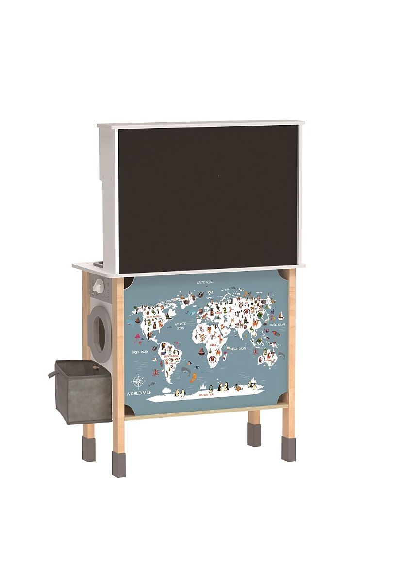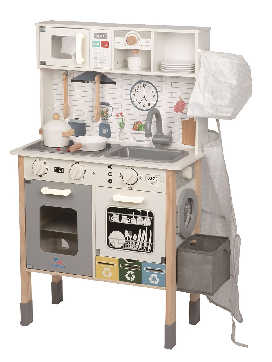 Szeretne friss süteményt közvetlenül a sütőből? Vagy inkább valami sült ételre vágyik? Ezzel a konyhával bármilyen menüt elkészíthet, amit csak szeretne. Teljesen felszerelt! Minden megtalálható benne, ami egy modern konyhából nem hiányozhat - tűzhely sütővel, mosogatógép, mikrohullámú sütő, mosogató, kávéfőző és természetesen edények és eszközök, mint például tányérok, fazék, serpenyő, bögre és mások. A konyha oldalán található egy mosógép, amelyből a mosott ruhát a felakasztható, levehető kosárba lehet helyezni. A konyha hátsó része sem maradt kihasználatlan. A praktikus fekete táblára a gyerekek üzenetet írhatnak, recept hozzávalókat jegyezhetnek fel vagy rajzolhatnak valamit. Inspirációként szolgálhat nekik a hátul található szórakoztató állatos térkép is. Tegye fel a szakácssapkát, vegye fel a praktikus kötényt, és kezdődhet a főzés. Mivel fontos számunkra a Föld bolygó, nem feledkezhetünk meg a szelektív hulladékgyűjtő kosarakról sem! Főbb jellemzők: gazdag kiegészítőkkel multifunkcionális, sokféle felhasználás fejleszti a kommunikációs és szociális készségeket FSC® tanúsítvánnyal rendelkező fából készült. Az FSC® (Forest Stewardship Council) márka és tanúsítvány garantálja, hogy a termékhez használt fa nem illegálisan lett kitermelve, és környezetkímélő vagy természetközeli módon kezelt erdőkből származik, ahol szigorú környezeti és szociális követelményeknek tesznek eleget. Az FSC® jelzés a terméken azt jelenti, hogy vásárlásával hozzájárul az erdők védelméhez és támogatja a környezetkímélő, felelős vagy természetközeli gazdálkodást, amelynek köszönhetően erdeink stabilabbak, egészségesebbek, természetes fajösszetételűek és jobban ellenállnak a klímaváltozás negatív hatásainak.