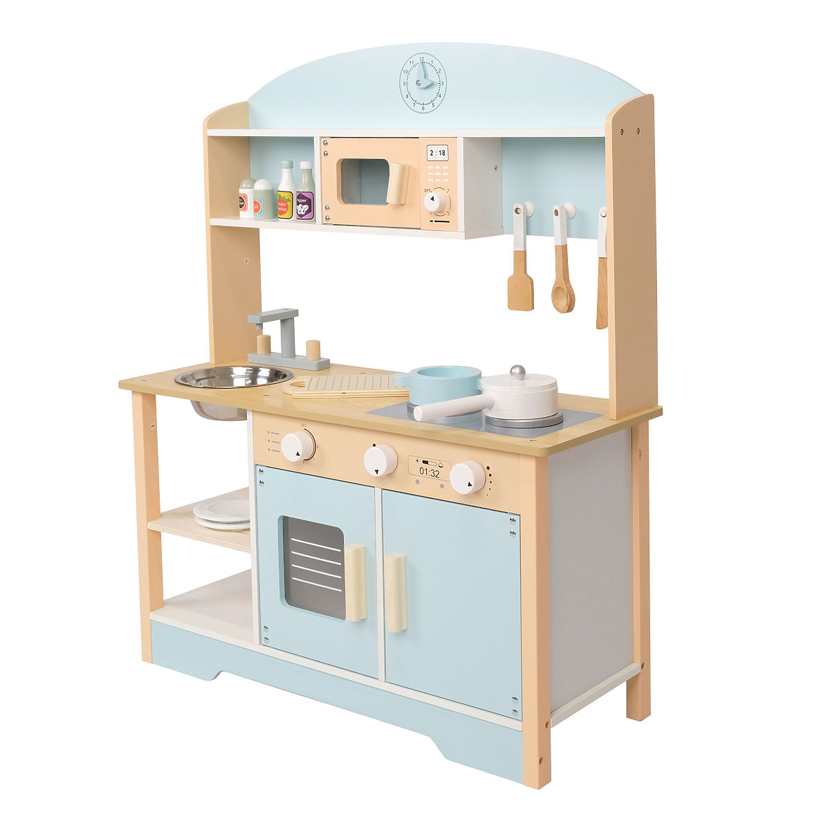 A konyhában a gyerekek fazekat, serpenyőt, tányérokat és egyéb konyhai eszközöket találnak természetes fából.