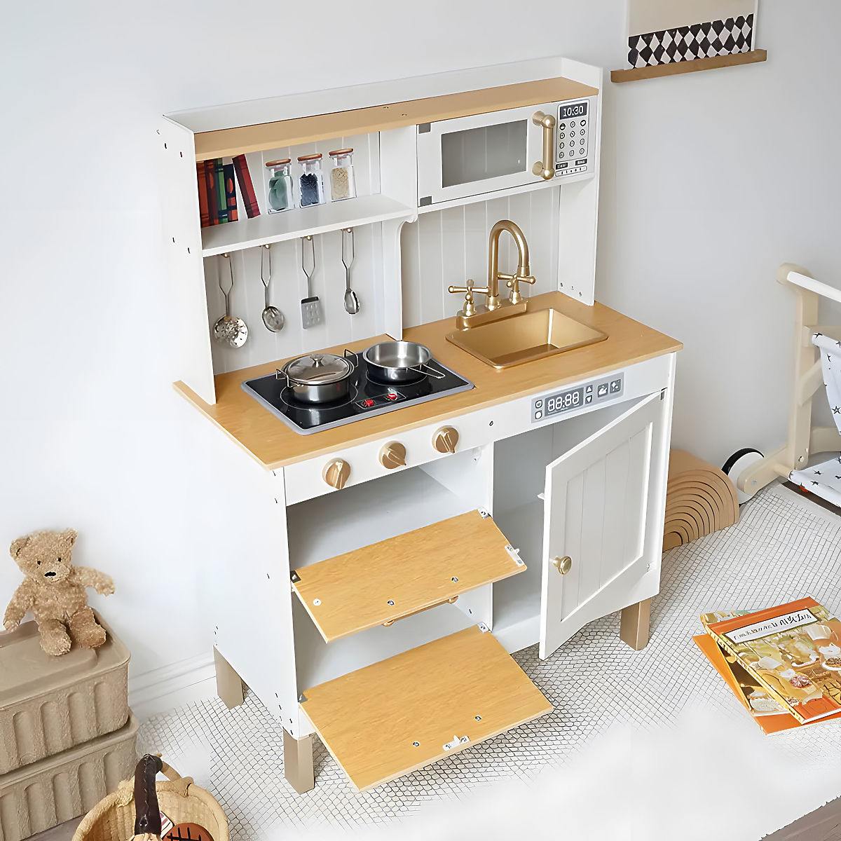 Banaby.hu » Játékok / Gyerek játékkonyhák / Fa konyhák / Gyermek konyha hangokkal és LED-del, nagy fa nyitható szekrényekkel, 7 kiegészítővel, ECOTOYS