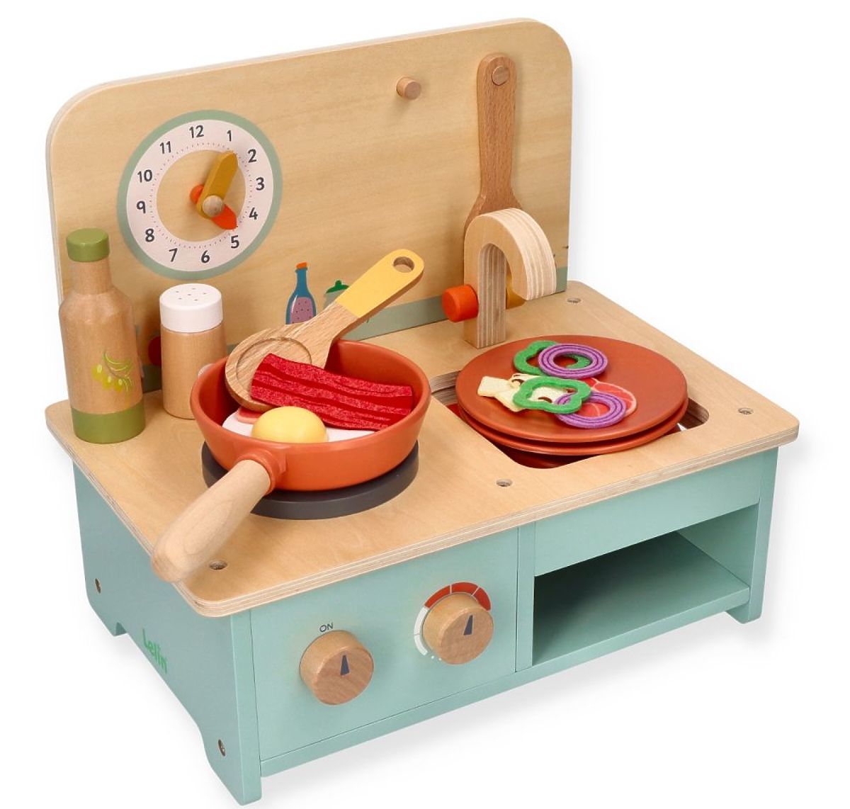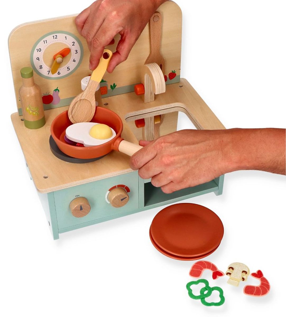A főzőlap kiegészítőkkel ideális játék azoknak a gyerekeknek, akik szeretnek felnőtteket utánozni és főzősdit játszani. A készlet része egy valósághű főzőlap gombokkal, égővel, mosogató csappal, valamint alapvető konyhai eszközök: serpenyő, kanál, spatula, só és olaj. A konyha továbbá órával is fel van szerelve, amely lehetővé teszi az "elkészített ételek" idejének ellenőrzését.