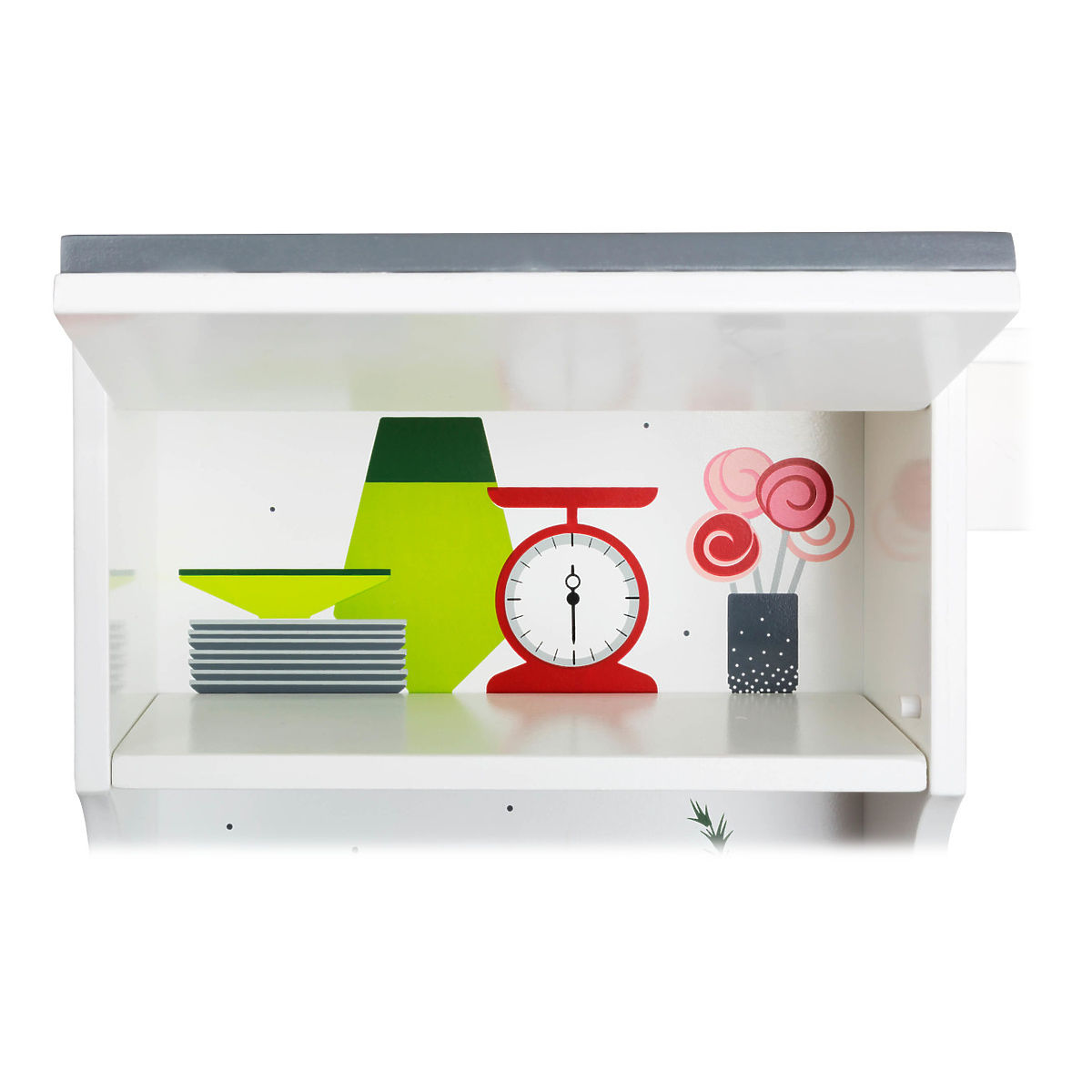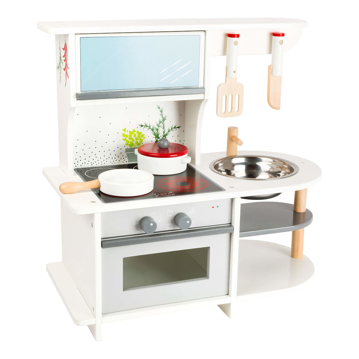 A kicsik szeretnének szakácsok lenni, főzni, mint a felnőttek, vigyázni és ugyanolyan hasznosnak érezni magukat? A játékon keresztül nem csak a képzelőerőt, hanem számos hasznos képességet is fejleszthetnek. A Graceful kompakt konyha korlátozott helyekre alkalmas. Kivehető bádogmosdóval rendelkezik, amely vízzel megtölthető, és a gyerekek a való élethez hasonlóan mosogathatnak benne. A többfunkciós tűzhely mágneszáras ajtós sütővel és nagy ablakkal van felszerelve. A sütő praktikus tárolóhelyként használható, ahol számos kiegészítő és játék könnyen megtalálja a helyét. A készülék vezérlőgombjai kattanó hangokat adnak ki elfordításkor, így a játék még hihetőbbé válik. A tűzhely felett található egy szekrény, amelyben a gyerekek élelmiszer-, edény- és edénymaketteket tárolhatnak. További tárolópolcok és kampók is rendelkezésre állnak. A konyhát alaptartozékokkal szállítjuk, melynek köszönhetően azonnal játékra kész. A robusztus és strapabíró fa konstrukció hosszú, sokféle élménnyel teli élettartamot biztosít. A termék összeszerelést igényel, képes összeszerelési útmutatóval együtt szállítjuk. Főbb jellemzők: konyhai készlet, edény fedővel, serpenyő, kés és forgató kivehető fém mosogató, sütőajtó mágneses zárással különféle tárolóhelyek és tárolóhelyek hangeffektusok a készülékek vezérléséhez robusztus és tartós fa kivitel