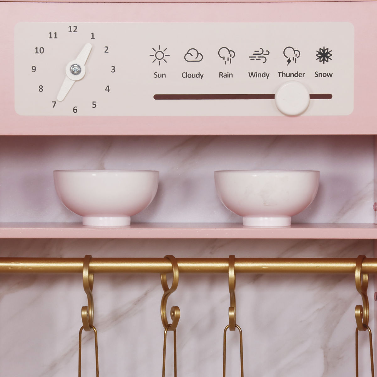 Hozza el a szórakozást és kreativitást a gyerekszobába a Siena rózsaszín konyhával, elegáns arany kiegészítőkkel. Ez a stílusos konyha mindennel fel van szerelve, amire a kis szakácsoknak szüksége van: tűzhellyel és sütővel, mikrohullámú sütővel, mosogatóval működő csappal, mosógéppel, hűtőszekrénnyel, függönyökkel és polcokkal. Minden részlet átgondolt, és támogatja a háztartási játékot és a képzelőerő fejlődését.