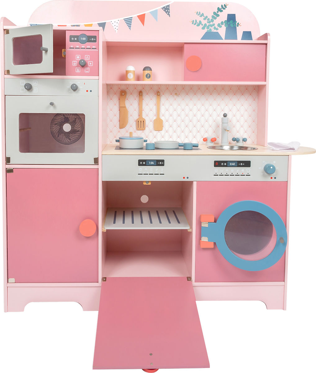 Ezzel a konyhával a Michelin-csillag az Öné! Ez a gyermek fa konyha modern rózsaszín retro megjelenéssel, tűzhellyel, mosogatóval, mosógéppel, mosogatógéppel, hűtőszekrénnyel, mikrohullámú és légkeveréses sütővel hosszú órák szórakozását biztosítja. A gombok kattognak, és a készülékek ajtajai nyithatók. A szett tartalmaz tálaló evőeszközöket, fazekat, serpenyőt, só- és borsszórót. Főbb jellemzők: számos készülék, mágneses záródású ajtók és kattogó számlapok, valósághűen illusztrált kezelőpanelek, kis főzőkészlet tartozék, tárolóhely, támogatja az aktív szerepjátékot és a szociális készségeket.