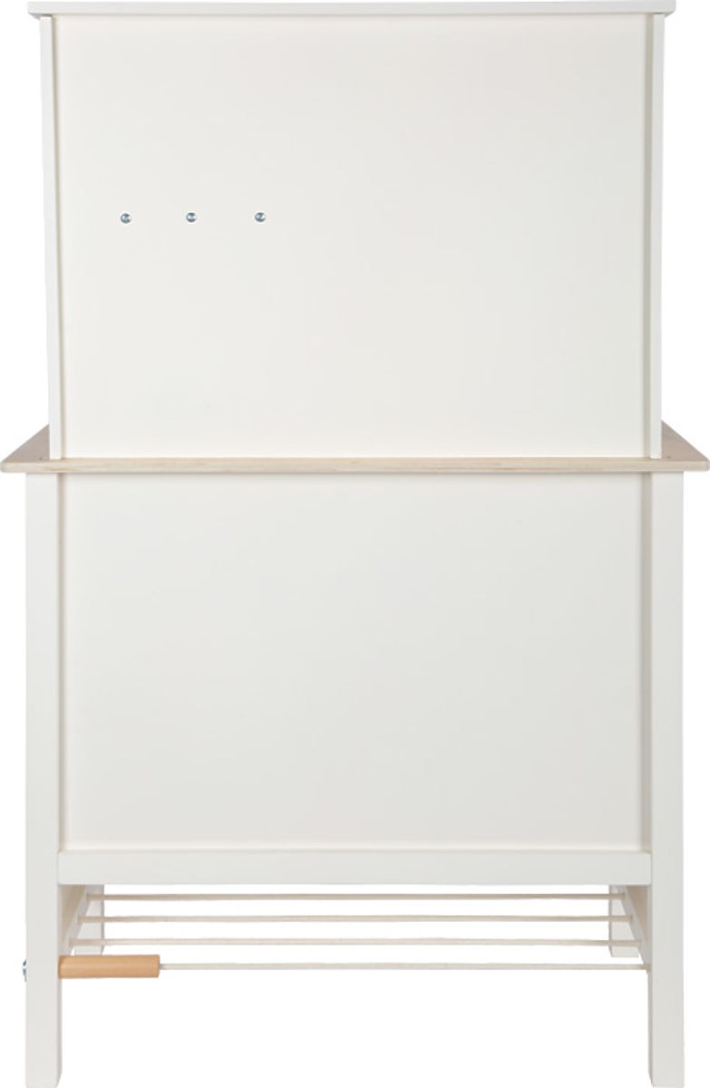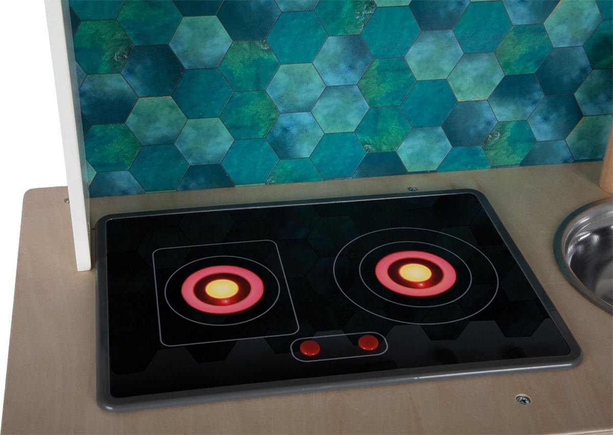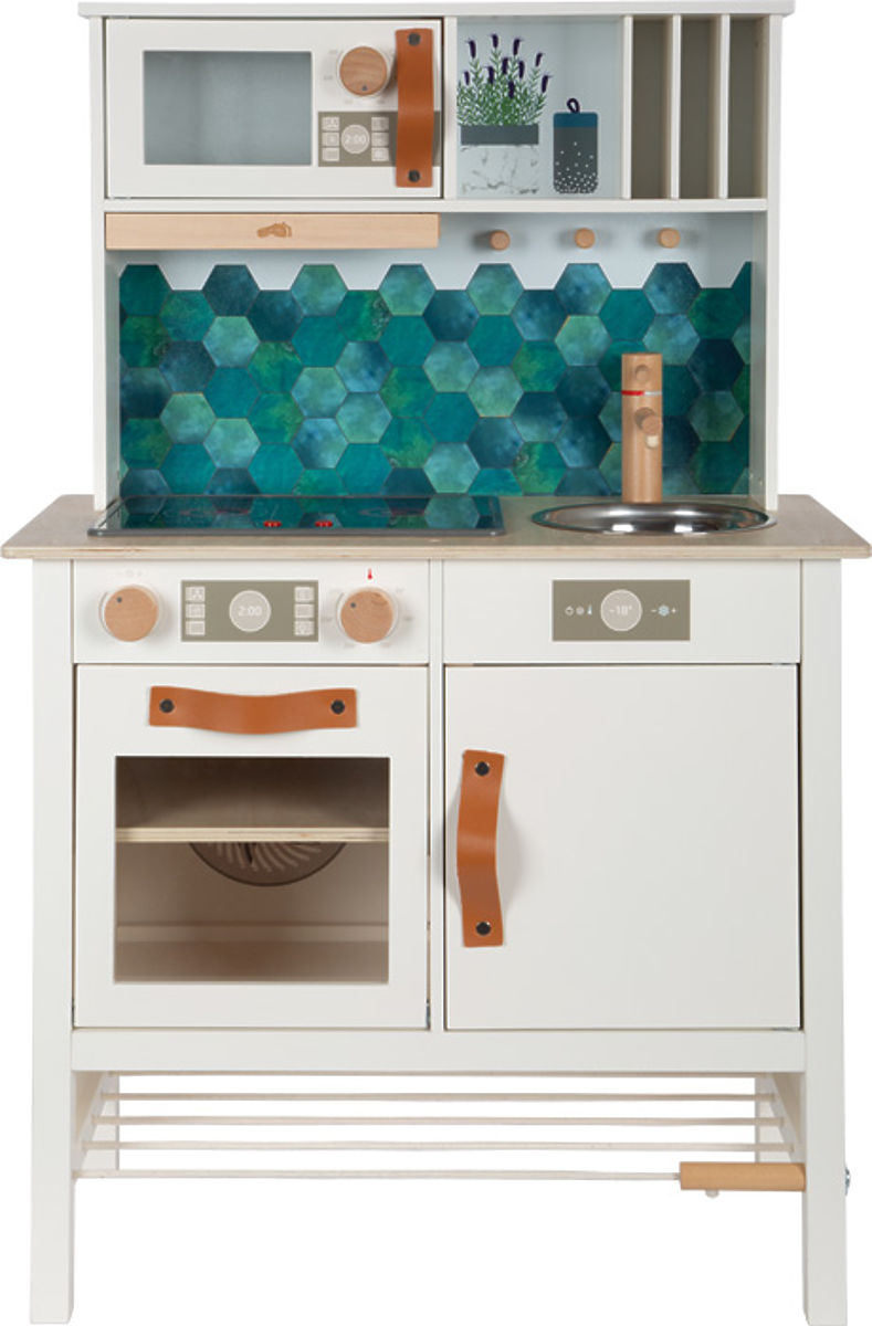 A videó csak illusztráció. Modern gyerek konyha robusztus szerkezettel trendi fehér színben, stílusos konyak színű bőr fogantyúkkal kombinálva. Azonnal készen áll a játékra a mellékelt fedeles fazékkal, serpenyővel és fém konyhai eszközökkel. Fém mosogatóval és forgatható gombokkal érkezik, amelyek hangot adnak ki. Tartalmaz egy elektronikus főzőlapot fény- és hanghatással, valamint egy visszahúzható páraelszívót fényjelzéssel. A kivehető tepsi rajztáblaként is használható. A hűtőszekrény és a sütő felületei konyhai részletekkel vannak nyomtatva a nagyobb játékélmény érdekében. Kétoldalas hátsó panel kiváló minőségű nyomtatással, csempehatású vagy egyszerű fehér színben. Tökéletesen kiegészíthető a Tasty kollekció további termékeivel és konyhai eszközeivel. Főbb jellemzők: fém kiegészítők és tartozékok, funkcionális elemek, mint a kattogó gombok, fény- és hanghatású főzőlap, új modern dizájn, tápellátás - 2xAA elem (nem tartozék), kiegészíthető a Tasty kollekció termékeivel.