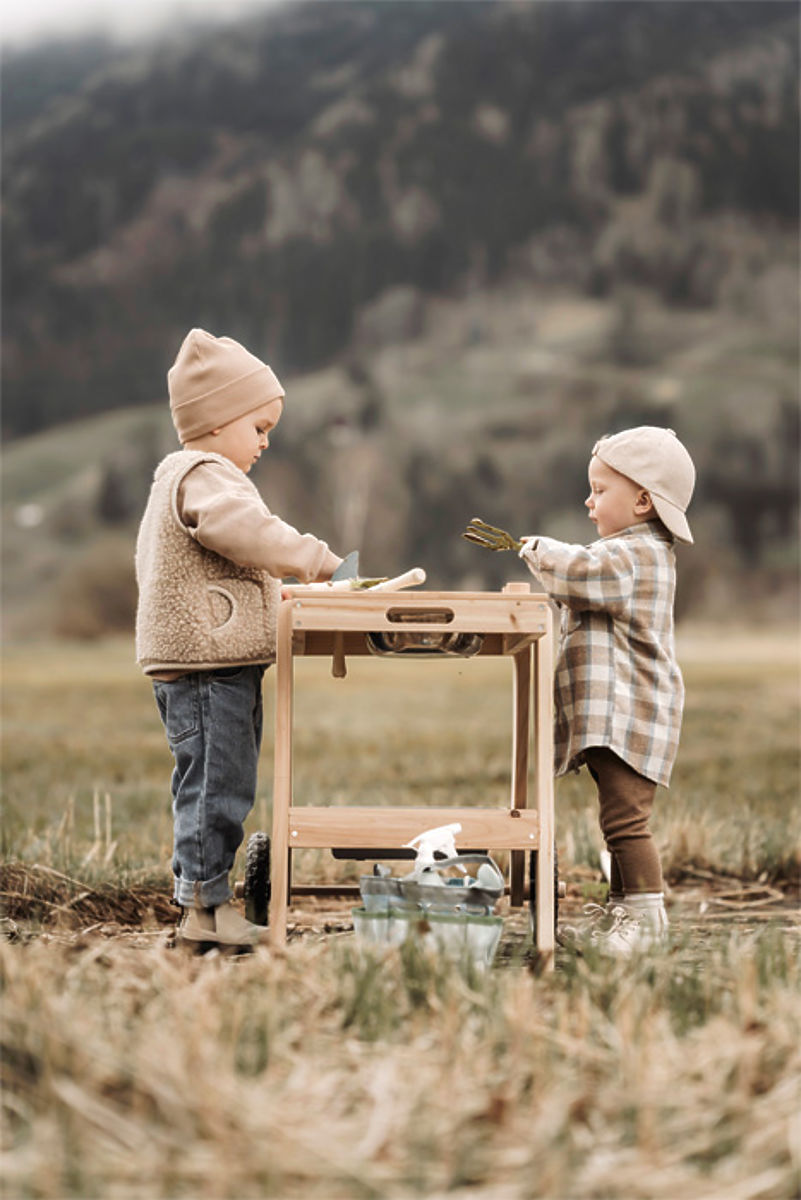 Öblítés, főzés és építés vízzel és homokkal! Ez a kültéri „nyári” játékkonyha ideális kis kertbe, teraszra vagy erkélyre. A kompakt méretek ellenére a konyha elegendő helyet kínál a kreatív játékhoz. Két kivehető tálat tartalmaz, amelyek beindíthatják az egész építési és kulináris folyamatot. A főzőlap forgatható gombokkal és számos nyílással van ellátva, amelyek például víztömlő nyílásként szolgálhatnak. A masszív kerekeknek köszönhetően a konyha könnyen mozgatható. Kiegészítőként vagy alternatívaként szolgálhat a homokozóhoz, és a legaranyosabb „homok” sütemények és más finomságok elkészítéséhez. Főbb jellemzők: ideális kis kertbe, teraszra vagy erkélyre; praktikus süllyesztett nyílások homokozó játékokhoz vagy víztömlőhöz; kerekekkel ellátva, könnyen mozgatható; kezeletlen fa, amely alkalmas személyes átalakításokra és lakkozásra.