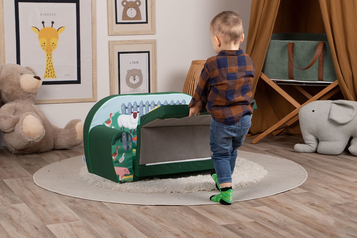 A kanapé vidám tehén, bárány, malac és más állatok motívumával minden gyerekszobát egy kis farmmá varázsol, tele nyugalommal. A puha habszivacs töltetnek köszönhetően biztonságos játékra, pihenésre vagy kedvenc könyvek olvasására is alkalmas. A levehető huzat kellemes és tartós anyagból készült, könnyen karbantartható, így a gyerekek élvezhetik a kényelmet, a szülők pedig a nyugalmat.