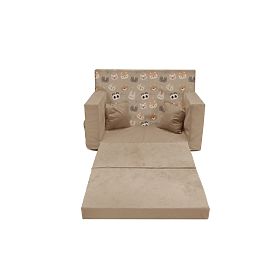 A bézs színű, mackómintával ellátott gyerek kanapé puha és könnyű habból készült. A gyermek könnyedén mozgathatja, kibonthatja és összecsukhatja az Ön segítsége nélkül.