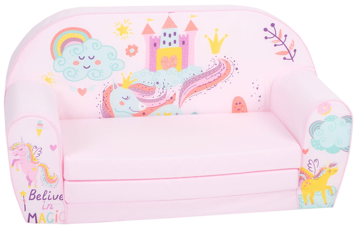 Rózsaszín kanapé varázslatos egyszarvúval, várral és szivárvánnyal. Csodálatos kanapé kis unikornis rajongóknak. Az előlapon a Believe in MAGIC felirat található. A gyerek kanapé puha és könnyű habszivacsból készült. Ez biztosítja, hogy biztonságos és praktikus a mindennapi használatra.