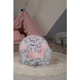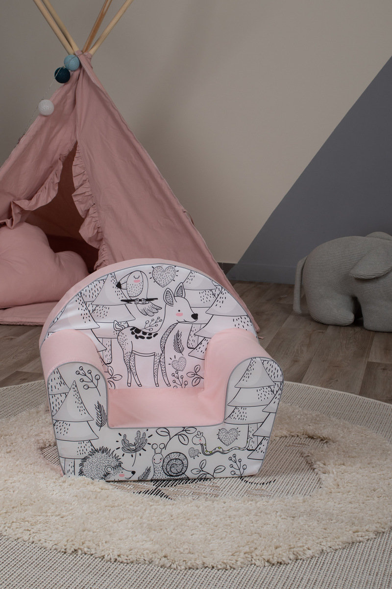 Színes fotel őzbarna és erdei állatok motívumával. A rózsaszín szövet és a fekete-fehér nyomtatás kombinációja alkalmas egy lány szobájába. A gyermekszék puha és könnyű habszivacsból készült. Ez biztosítja, hogy biztonságos és praktikus a mindennapi használatra.