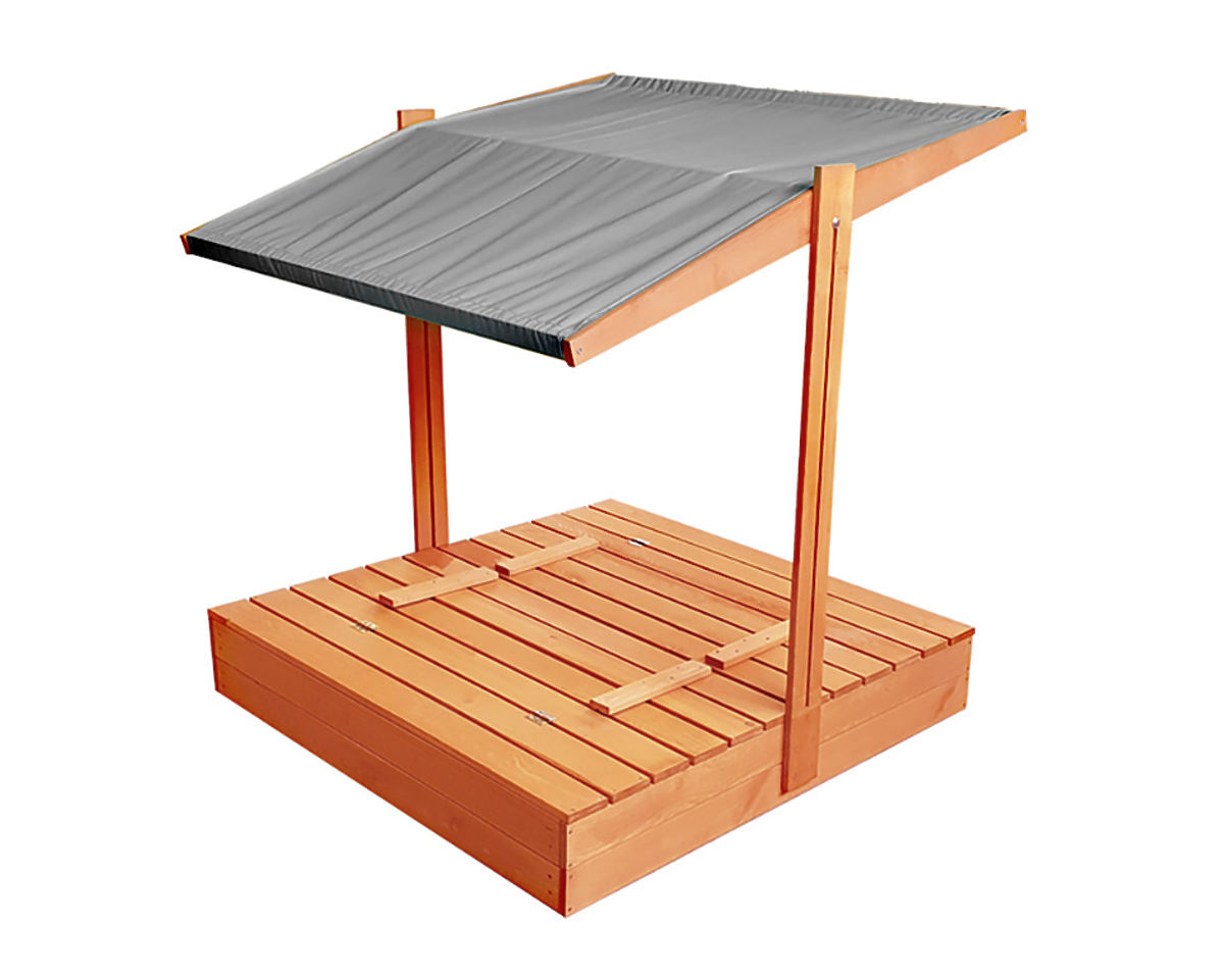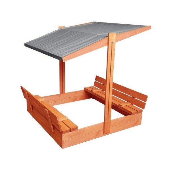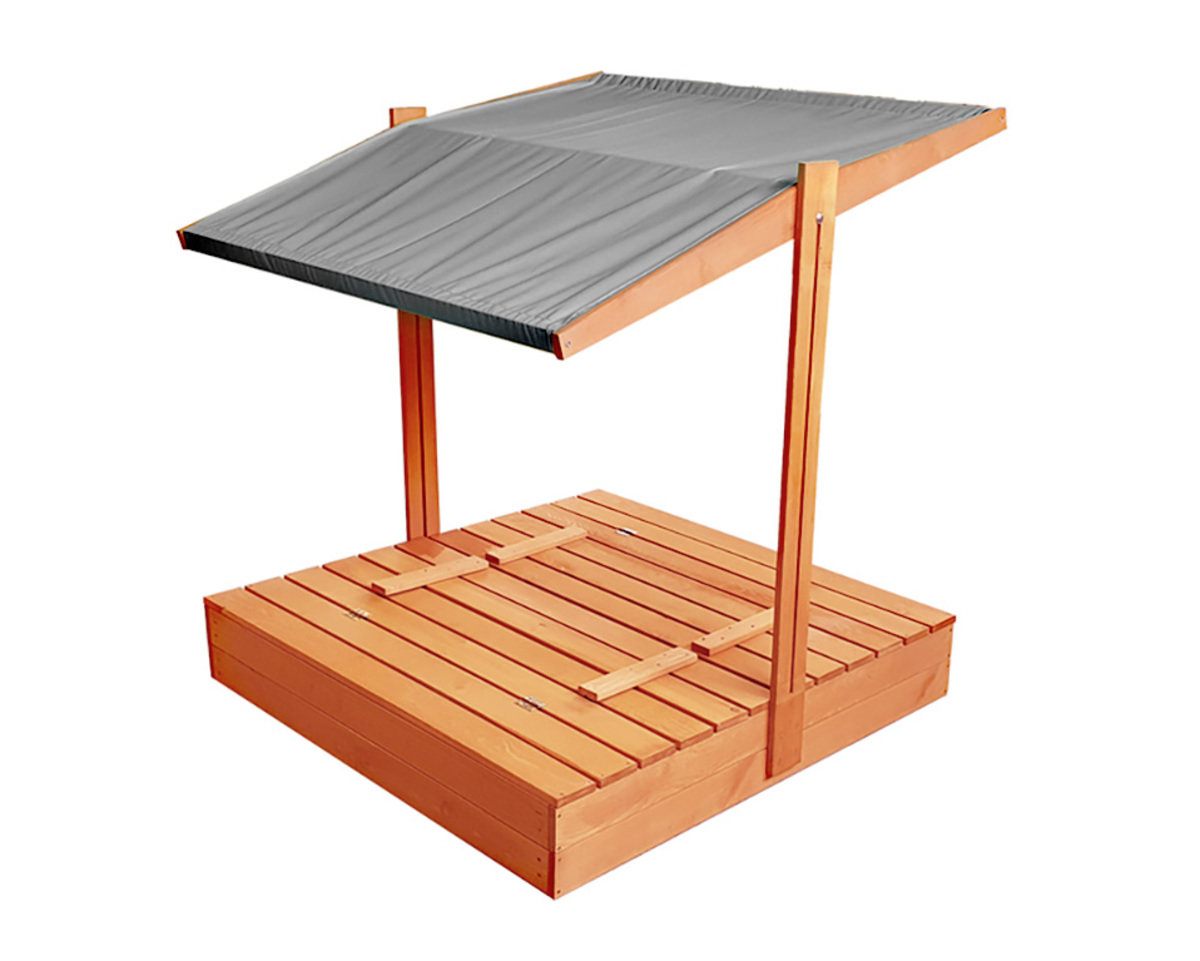 Gyermek fa homokozó zárható rendszerrel és szürke tetővel. A praktikus zárható rendszer pillanatok alatt két paddá alakítható kényelmes és biztonságos üléshez. A vízálló tető pedig megvédi gyermekeit a kellemetlen napsütéstől.