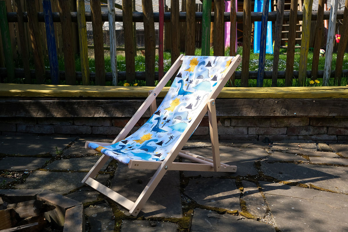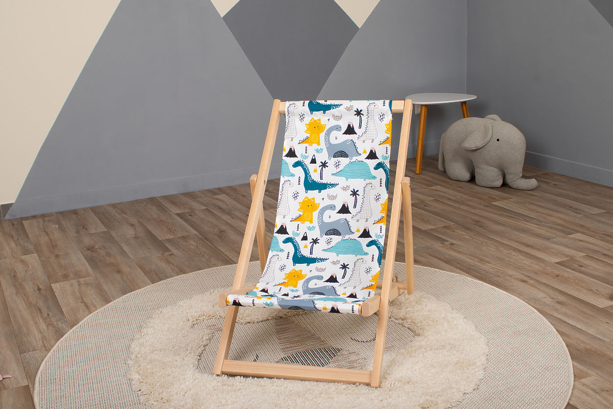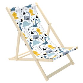 Egy gyönyörű strandszék aranyos dinoszauruszok mintájával. Az anyag gyönyörű fehér színű. A gyermek strandágy remek alternatívája a kerti széknek vagy fotelnek.