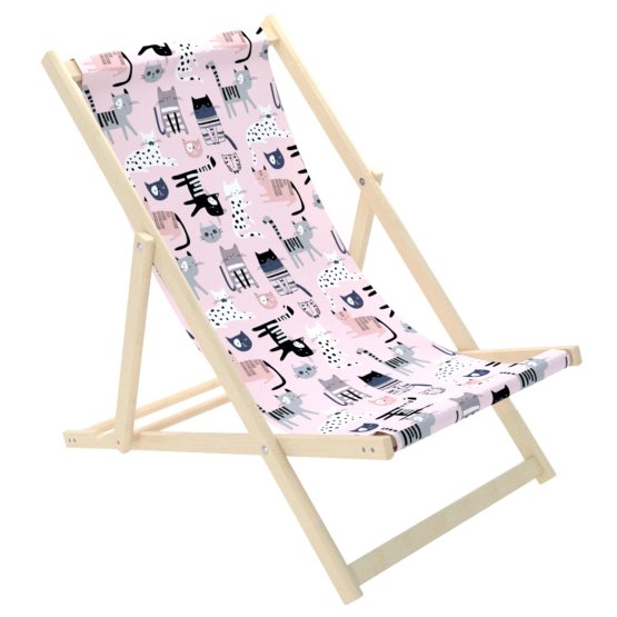 Egy gyönyörű tengerparti nyugágy aranyos macskák mintájával. Az anyag gyönyörű rózsaszín színű. A gyermek strandágy remek alternatívája a kerti széknek vagy fotelnek.