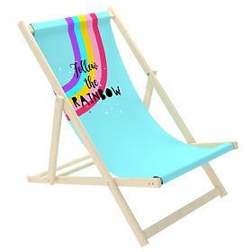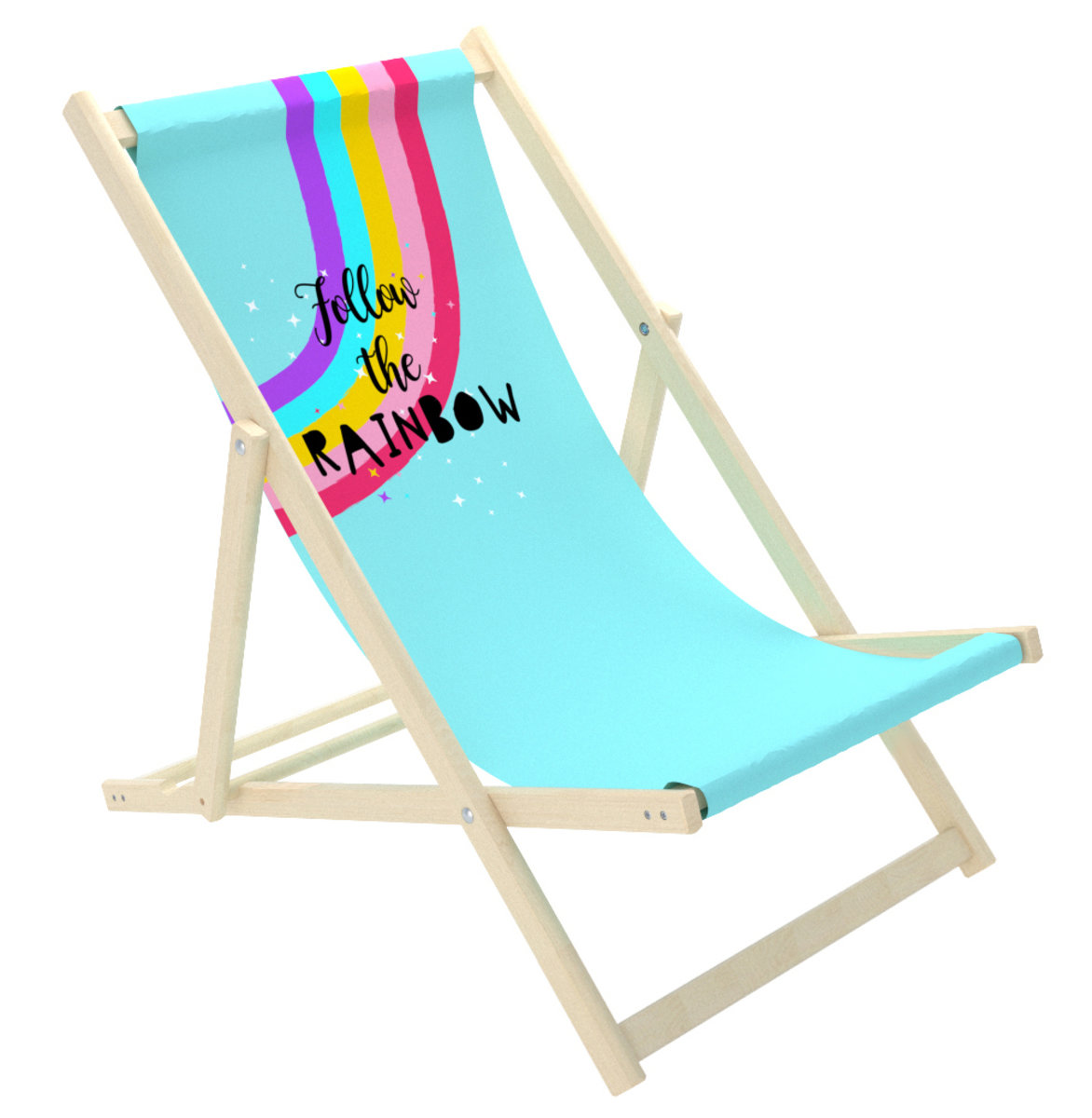 Gyönyörű strand nyugágy gyönyörű szivárványmintával és angol FOLLOW THE RAINBOW felirattal. Az anyag gyönyörű türkiz színű és gyönyörű nyári napokat sugároz. A gyermek strandágy remek alternatívája a kerti széknek vagy fotelnek.
