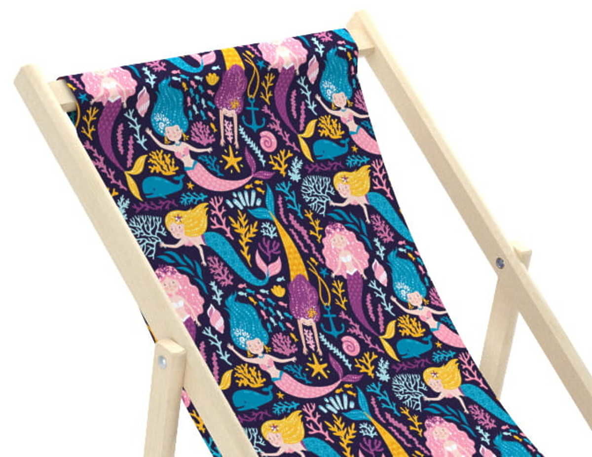 Egy gyönyörű strand nyugágy sellőmintával. Tündérek gyönyörű ruhák különböző színekben. A gyermek strandágy remek alternatívája a kerti széknek vagy fotelnek.
