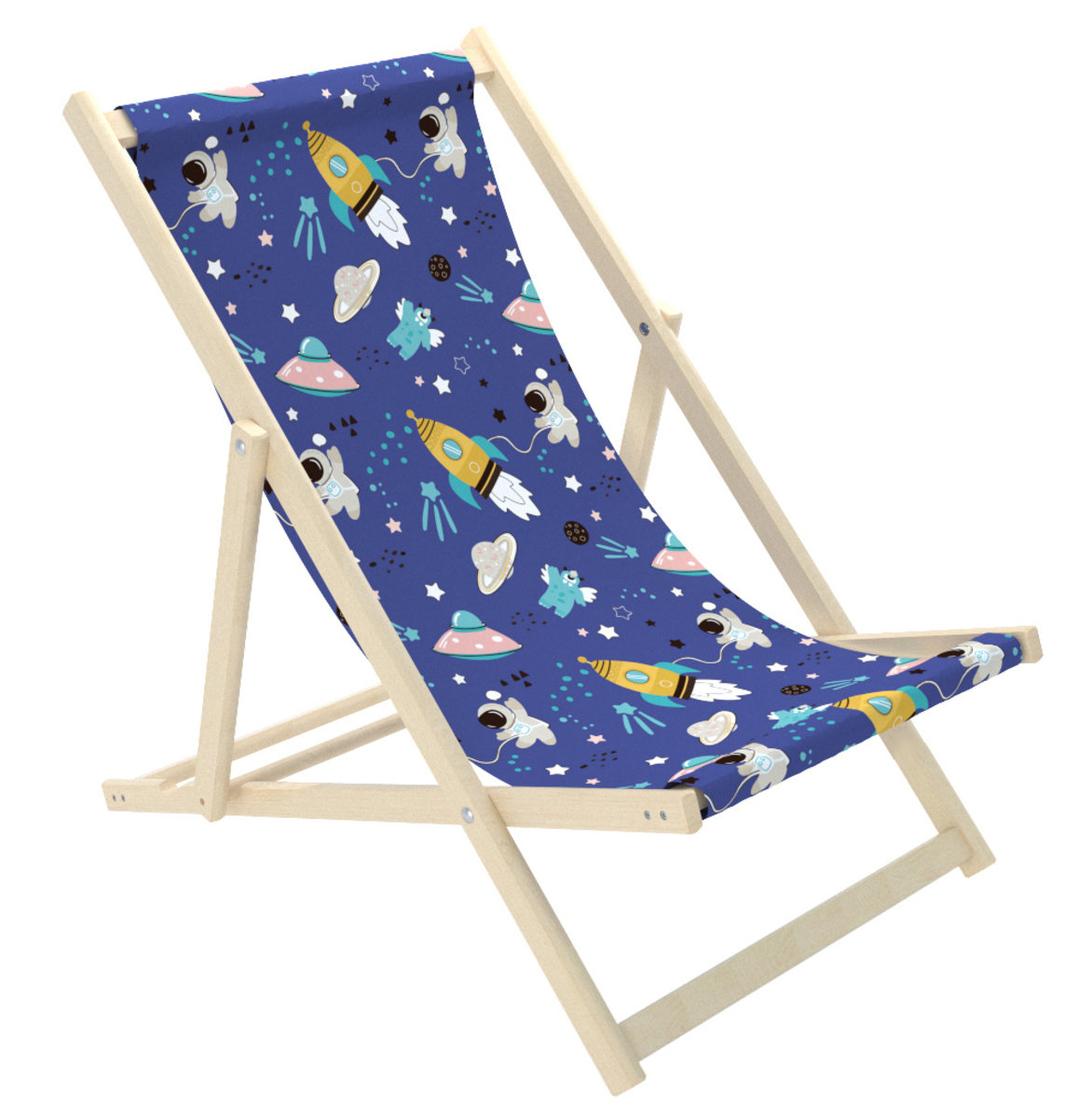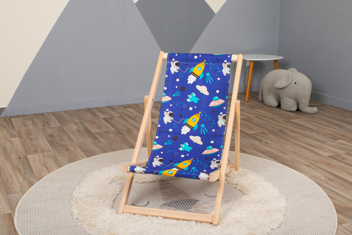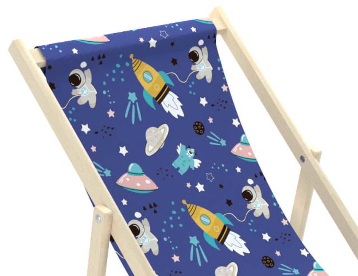 Egy gyönyörű tengerparti nyugágy űrhajósok és csillagok mintájával. Az anyag gyönyörű sötétkék színű és az univerzum mélységét sugározza. A gyermek strandágy remek alternatívája a kerti széknek vagy fotelnek.