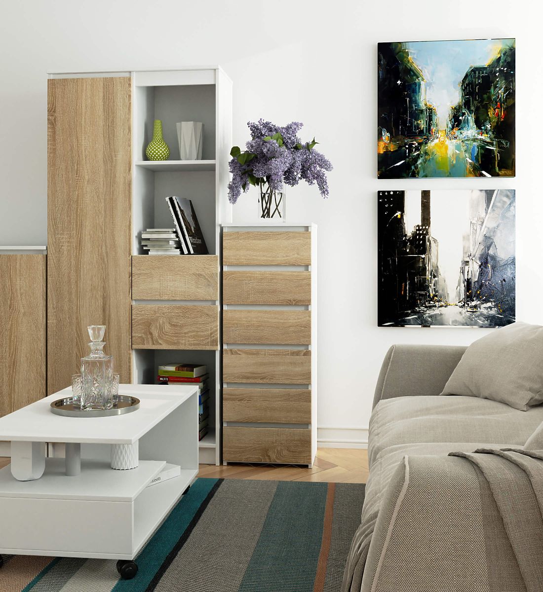 - elegáns megjelenés - a komód egyszerű formájú, stílusos fehér színnel és sonoma tölgy előlapokkal rendelkezik,