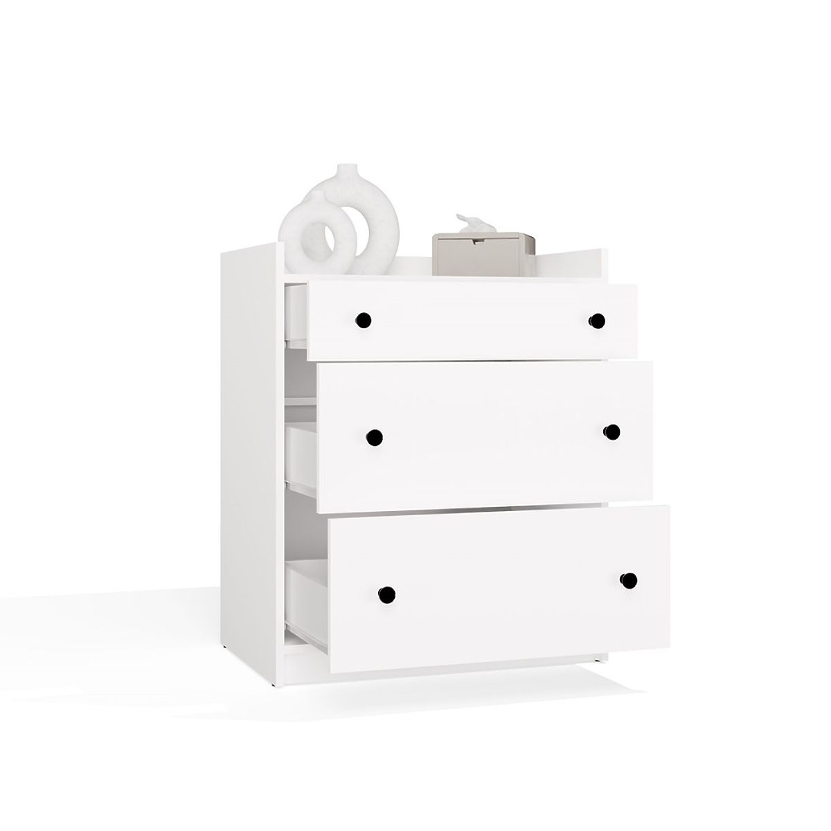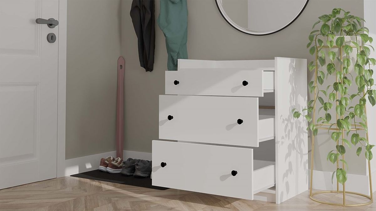 A 3 tágas fiók kényelmes fogantyúkkal elegendő helyet biztosít ruhák, kiegészítők, textilek vagy gyermekholmik tárolására.