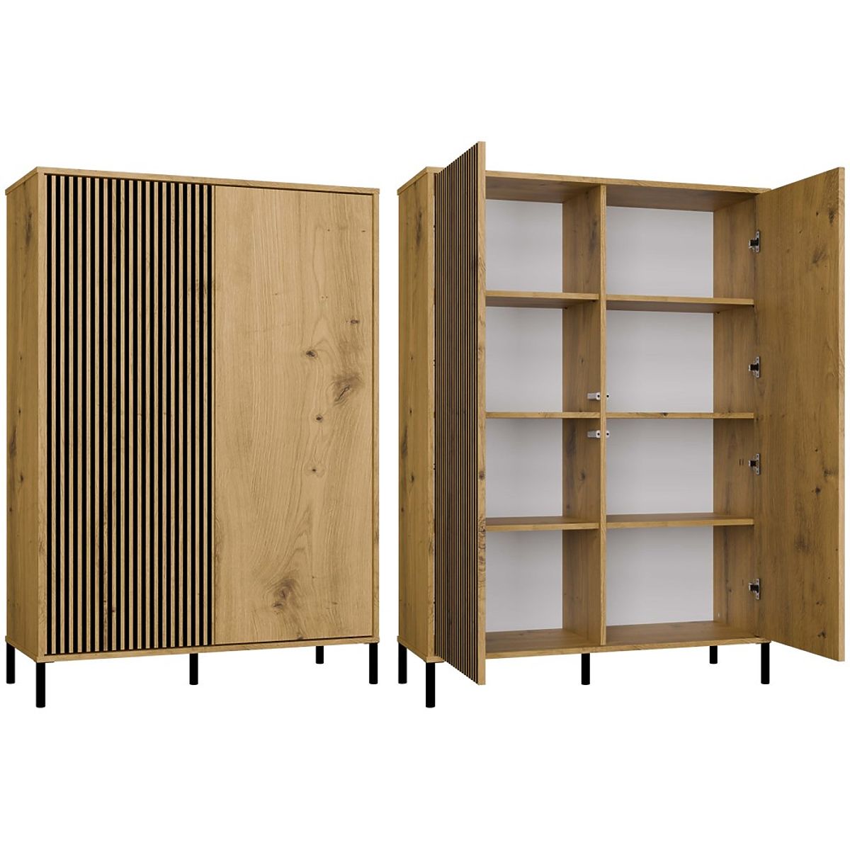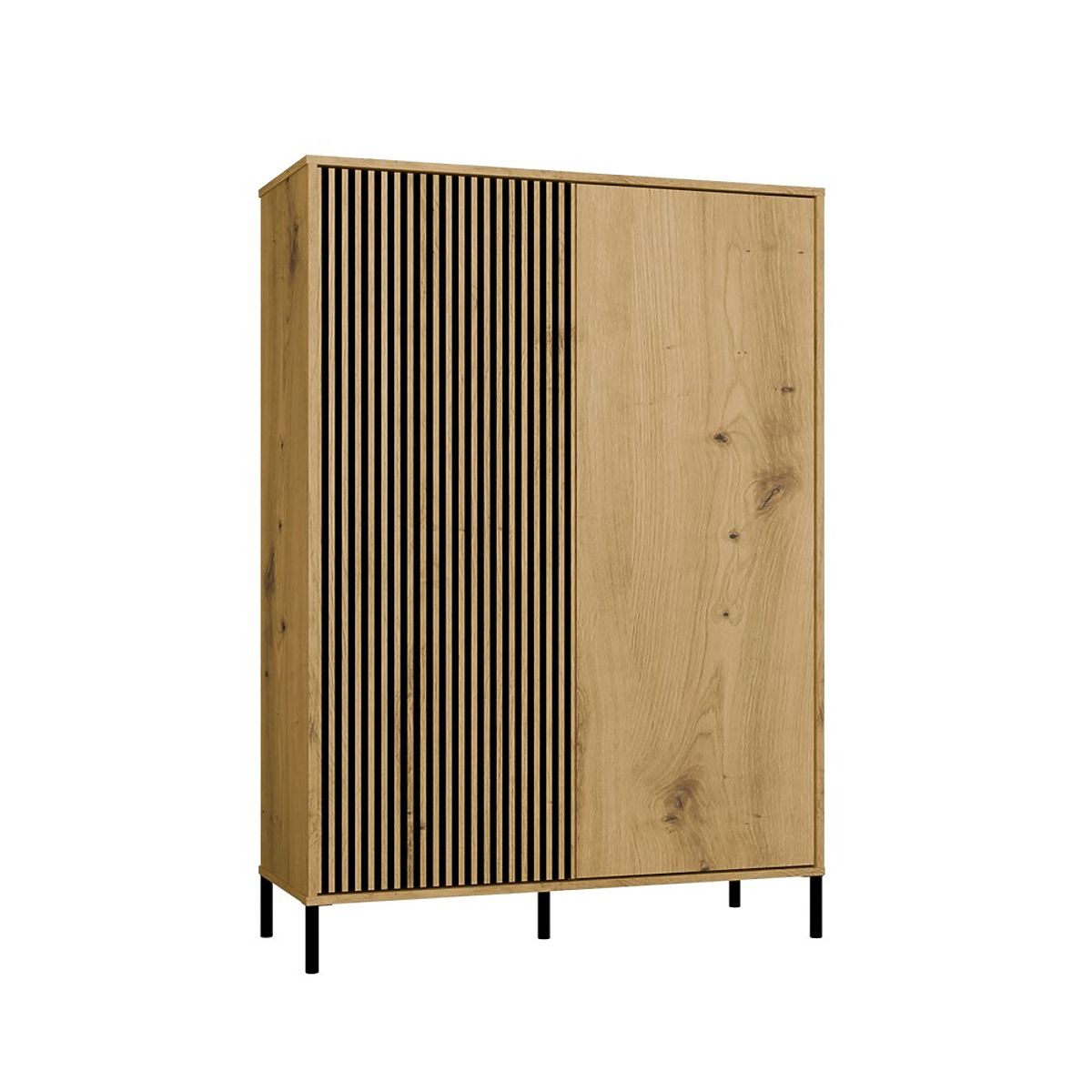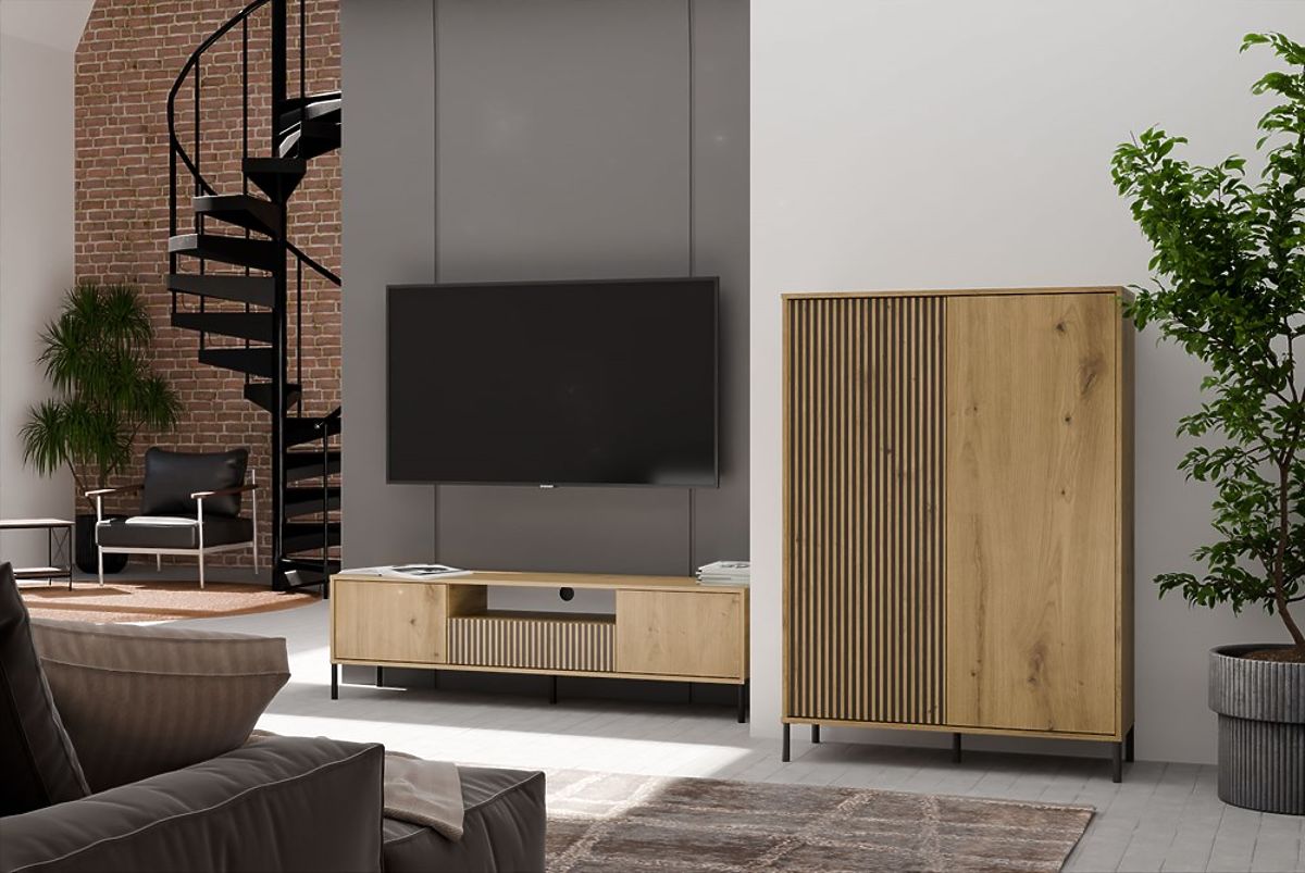 SZÍN:A KAMARO 2DD SLIM/SIMA ARTISAN TÖLGY vitrin az esztétika és a funkcionalitás kombinációja, amely kiválóan illik a nappaliba, vendégszobába, hálószobába vagy irodába. A sima előlapú és a lamellás hatású bordázott előlapú ajtók kombinációja karaktert kölcsönöz, míg a TIP-ON rendszer kényelmes fogantyú nélküli használatot biztosít. A bútor bőséges tárolóhelyet nyújt, miközben stílusos eleme a modern belső térnek.