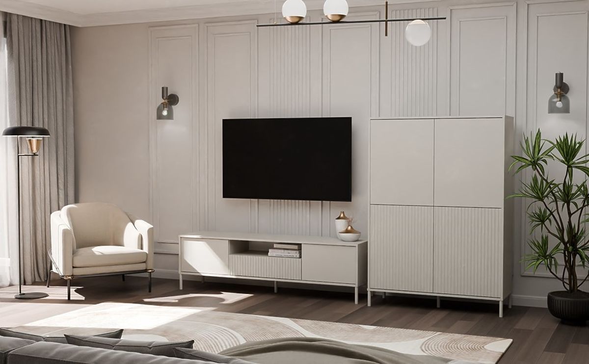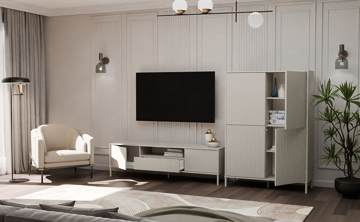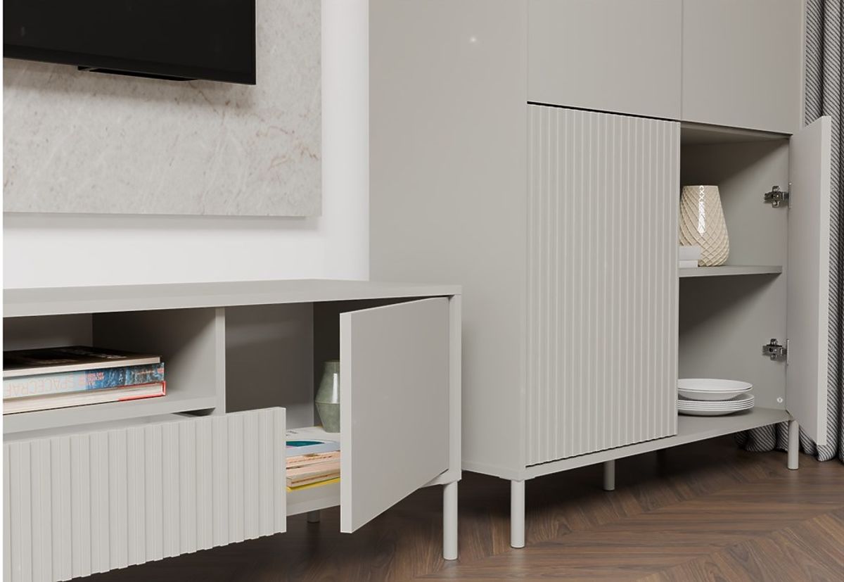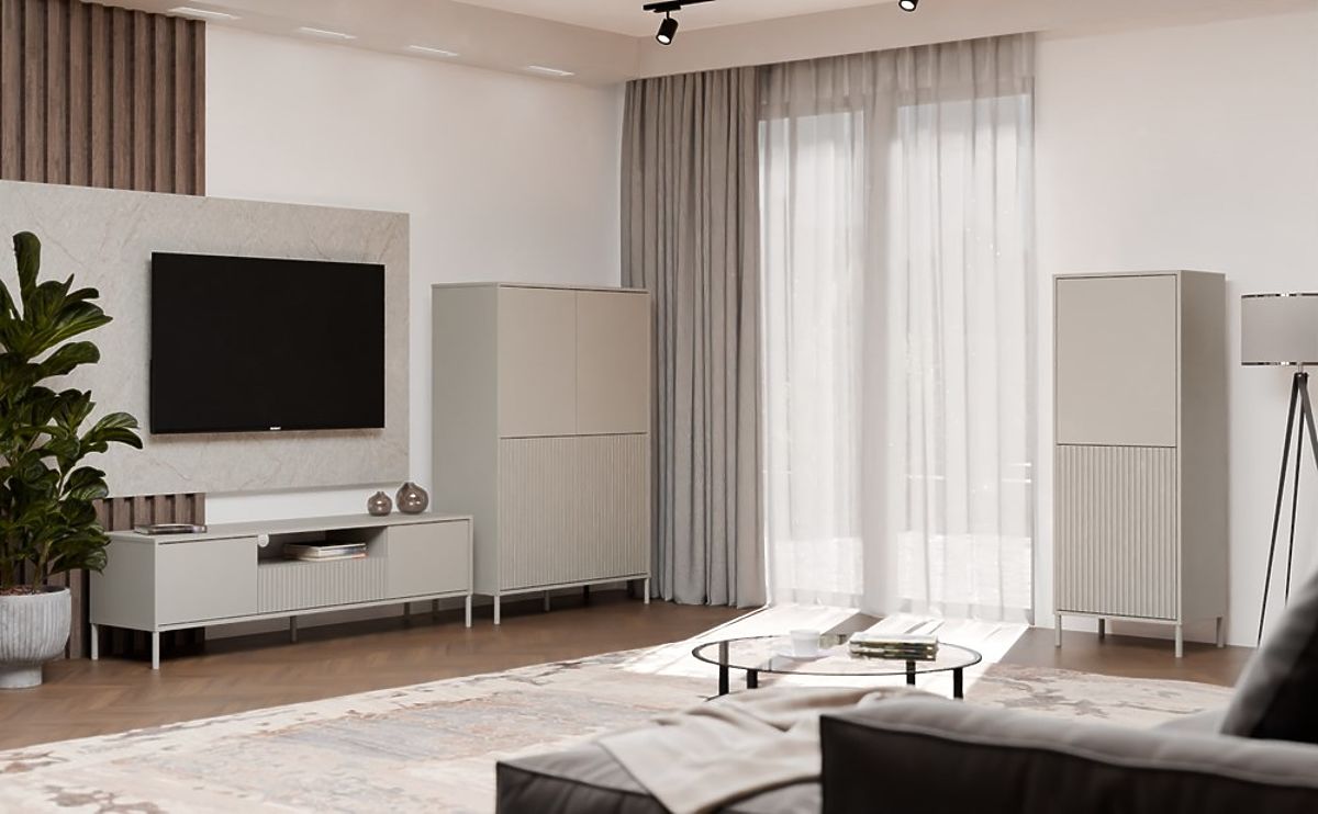A bútor felülete modern kasmír színben (elegáns bézs árnyalat) eleganciát és kortárs jelleget kölcsönöz a belső térnek, miközben megőrzi a semlegességet, amely könnyen illeszkedik különböző dekoratív stílusokhoz