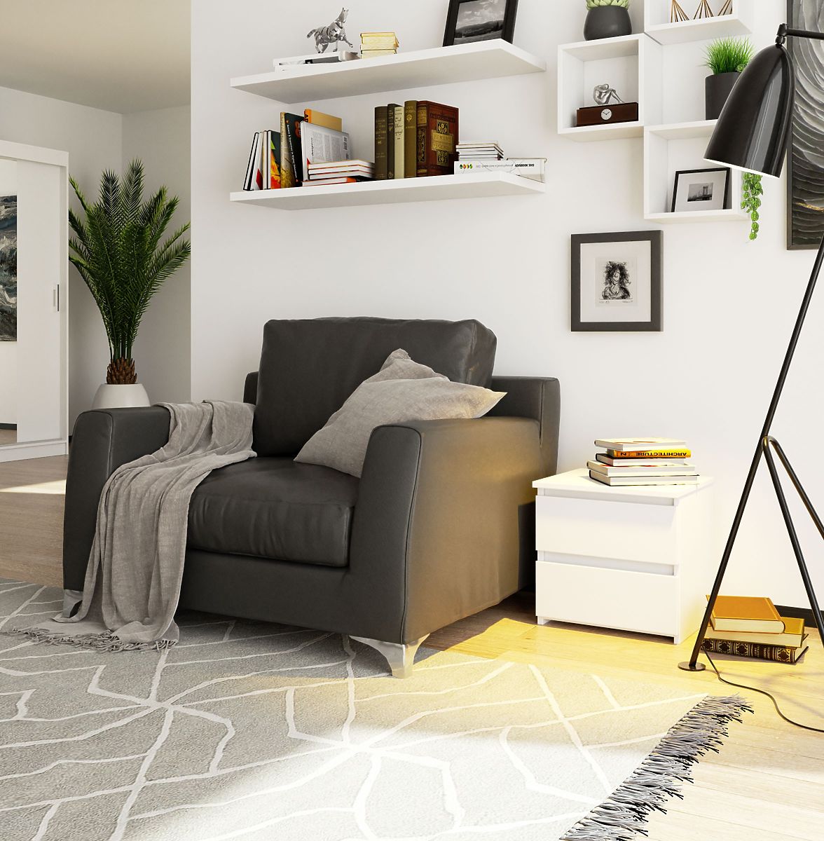 Az éjjeliszekrény az egyik alapvető bútordarab a hálószobában. Fehér színű, 16 mm vastag laminált lapból készült, amely kopásálló. Az éjjeliszekrény előlapjai és oldalai ABS élzárással vannak ellátva, amely nagyobb ellenállást biztosít a kisebb mechanikai sérülésekkel, például karcolásokkal szemben. Két tágas, fogantyú nélküli fiókkal rendelkezik, amelyekbe minden szükséges tárgy elfér, amit kéznél kell tartani. A szekrény méretei: 40 cm hosszú, 40 cm magas és 35 cm mély. A fiókok fém görgős síneken mozognak, amelyek szükség esetén könnyen kivehetők és tisztíthatók. Az univerzális minta és szín miatt bármely hálószobába illik, és sikeresen kombinálható a CLP rendszer más bútordarabjaival. A modern és egyben minimalista megjelenés lehetővé teszi, hogy számos belsőépítészeti stílusba könnyen beilleszthető legyen. A lap elég nagy ahhoz, hogy elférjen rajta egy éjjeli lámpa, valamint kisebb dekorációk vagy egy könyv.