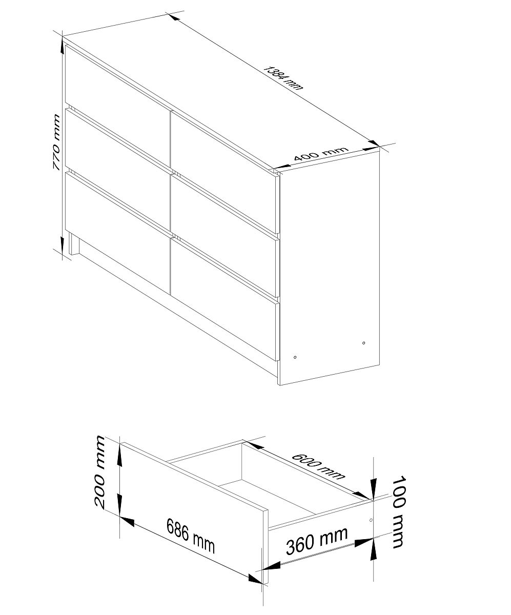 A komód anyaga kopásálló, 16 mm vastag laminált lemez. Élei ABS élzárással vannak ellátva, ami ellenállóvá teszi őket a sérülésekkel szemben. Hat fiókkal van felszerelve. Mindegyik fiók fém golyóscsapágyas síneken mozog - ez a mechanizmus simán és problémamentesen működik.