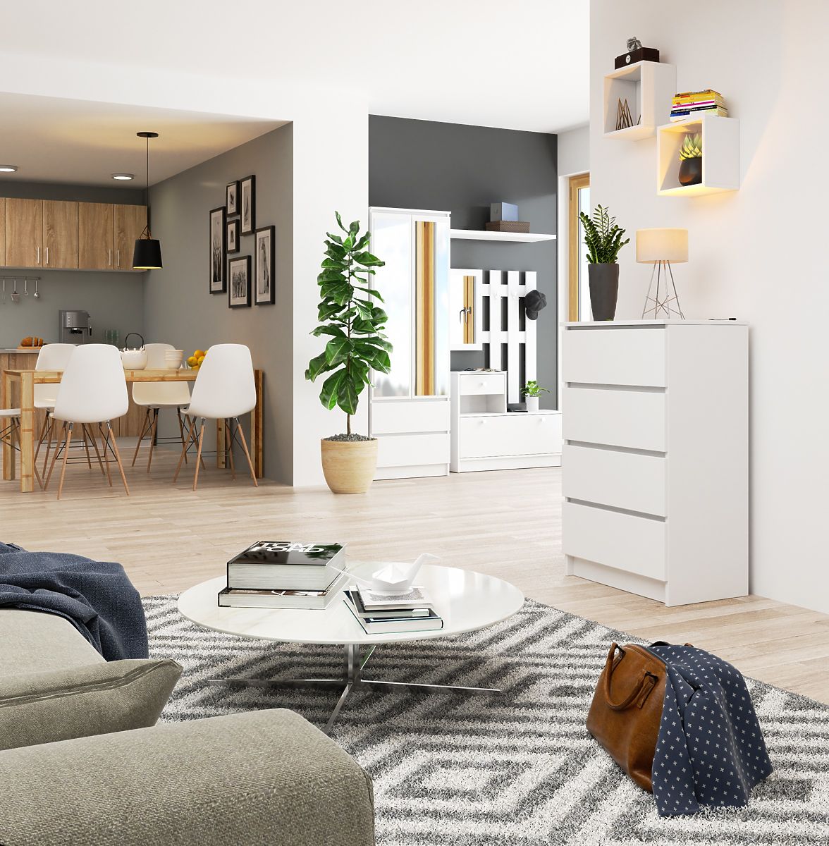 A magas fehér komód érdekes választás, amely használható lakó- és irodai terekben is. A funkcionális bútor négy fiókból áll, amelyek 16 mm vastag laminált lapból készültek. Az anyag magas kopásállóságot mutat, ami befolyásolja a komód tartósságát és szilárdságát. Figyelemre méltó a modern dizájnja - egyszerűség és elegancia, valamint minimalista stílus, amelyben megőrzött. Olcsó, de nagyon hatékony választás, amely biztosan tökéletesen ellátja funkcióját, lehetővé téve sok szükséges tárgy tárolását az előszobában, étkezőben, nappaliban, ifjúsági szobában vagy hálószobában. Az önálló összeszerelésre szánt termék rendkívül gondos és szilárd kidolgozással rendelkezik.