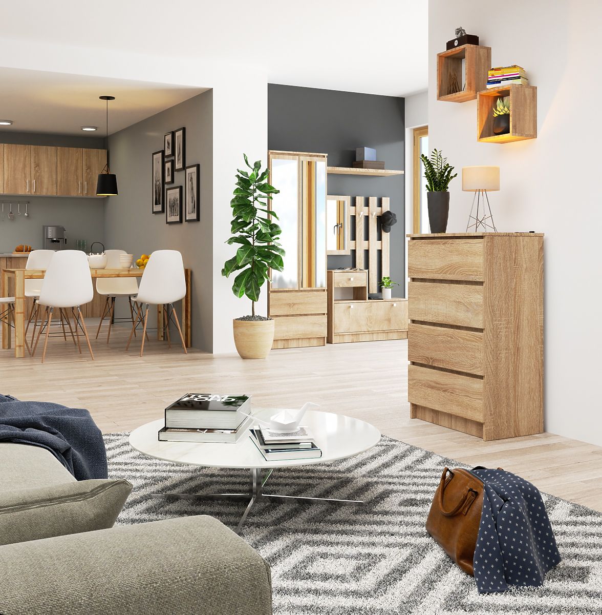 A K60 kis komód divatos, a vásárlók körében nagyon népszerű színben készült. Természetesen a sonoma tölgy árnyalat, amely remekül illeszkedik a modern belső terekhez, nagyon univerzális és csodálatosan kombinálható minden más színnel. Maga a komód kiváló minőségű bútor, amely négy praktikus fiókkal van felszerelve. Azoknak ajánljuk, akik a nappalijukat, hálószobájukat, előszobájukat, étkezőjüket, de akár irodai belső terüket is szeretnék berendezni. A magas minőség és az alacsony ár kombinációja biztosan meggyőzi azokat a vásárlókat, akik értékelik az egyszerűséget és az eleganciát a legjobb kivitelben. A komódhoz további bútorokat is választhat ugyanabból a kollekcióból, így álmai elrendezését hozhatja létre bármely kiválasztott térben.