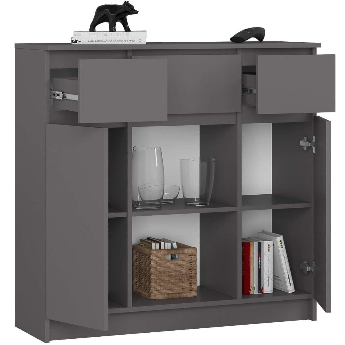 Grafit szürke komód három fiókkal és két ajtóval. .. többet