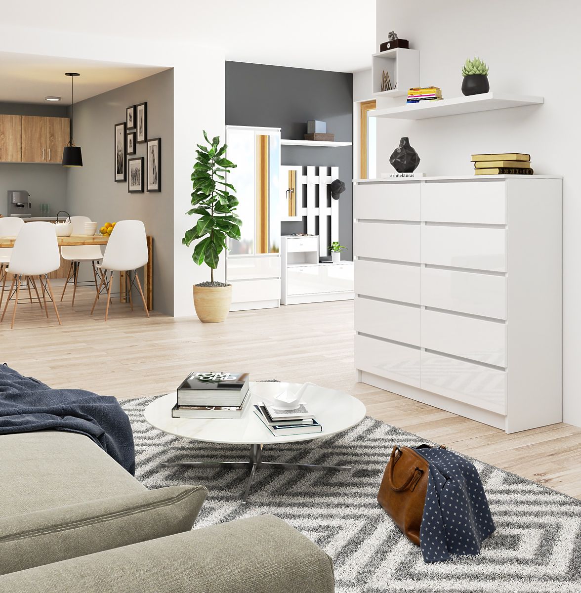 10 fiókos, 120 cm széles, magasfényű fehér komód. .. többet