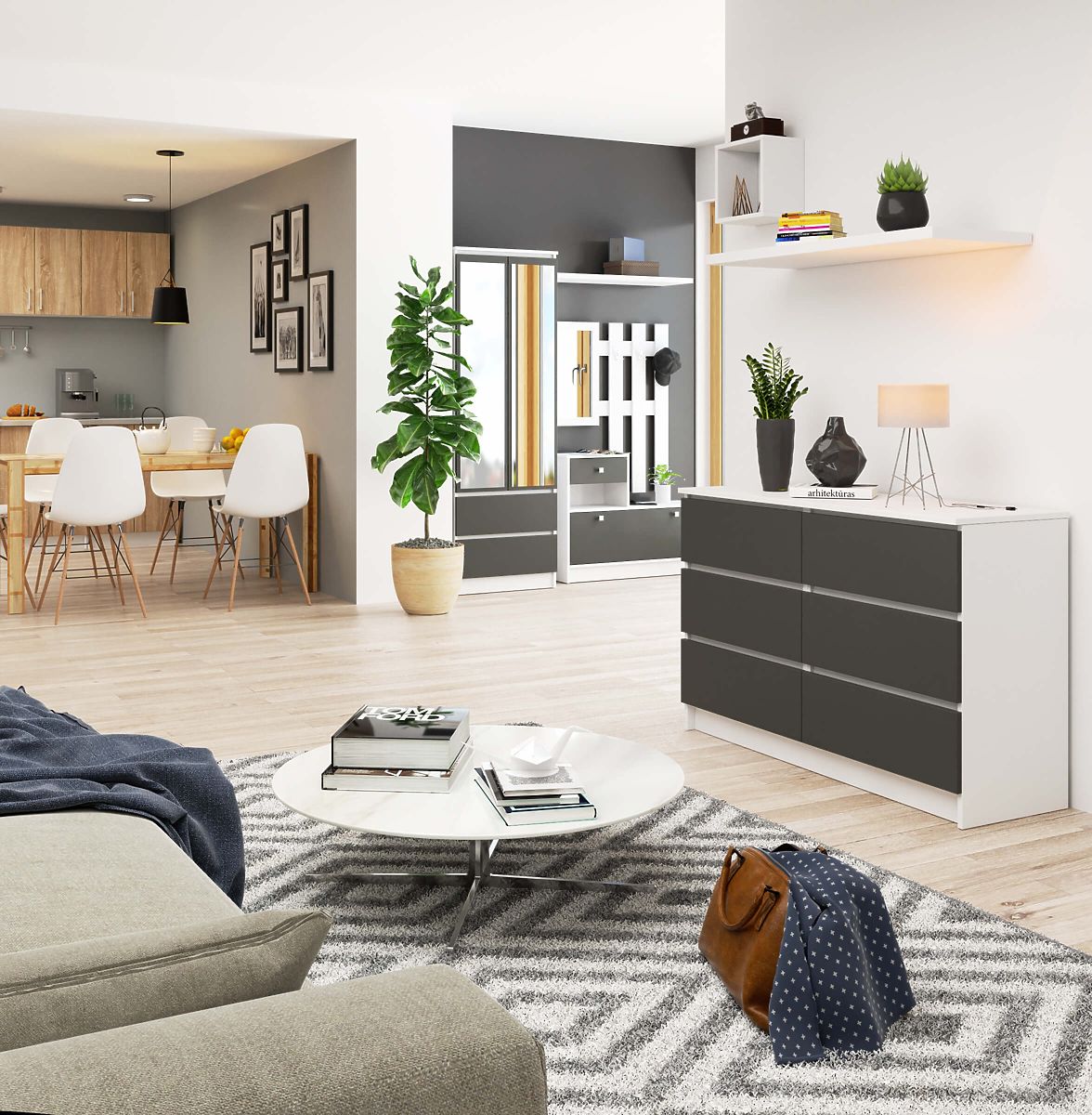 Komód 6 fiókkal, fehér test és grafit szürke előlapok. .. többet