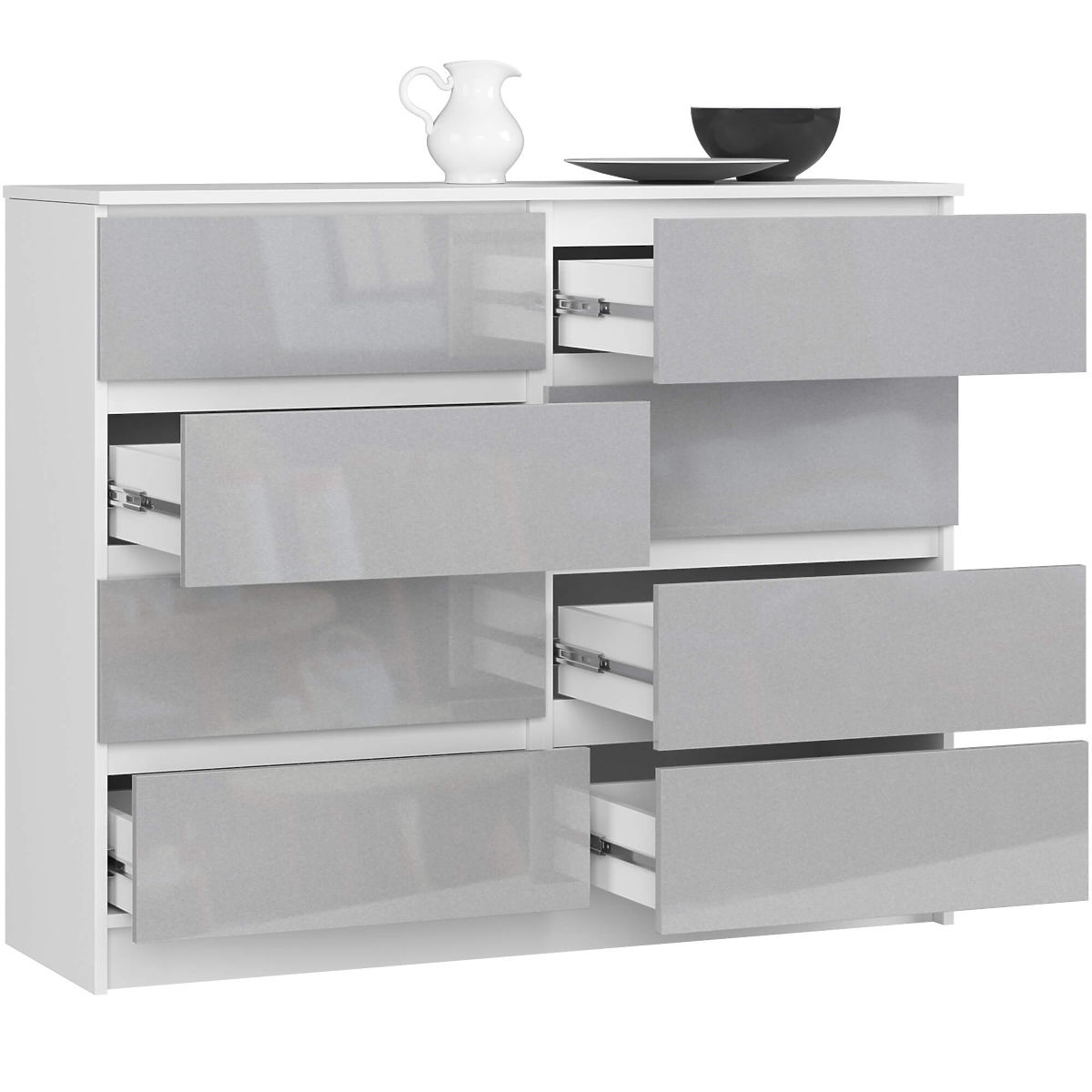 Nagy komódot kínálunk 8 fiókkal. A komód fehér félmatt korpusa 16 mm vastag laminált lapból készült, amely nagyon ellenálló a kopással szemben. Az előlapok 19 mm vastag MDF lapból készültek akril bevonattal, amely magas tartósságot biztosít és ellenáll a fakulásnak az intenzív napfény hatására. Az élek ABS szegéllyel vannak ellátva, amely magas védelmet nyújt a mechanikai sérülésekkel és kopással szemben. A fogantyú nélküli fiókok modern metálik színűek, magasfényű kivitelben. A fiókok fém golyós csúszkákon mozognak. A komód egyszerű és nagyon univerzális megjelenésű. Tökéletesen illik bármely belső térbe, jól mutat a nappaliban, hálószobában vagy akár az irodában is. A nagyon tágas és nagy fiókoknak köszönhetően minden helyiség rendben lesz. Ehhez a komód modellhez sikeresen illeszthető a CLP sorozat további bútora.