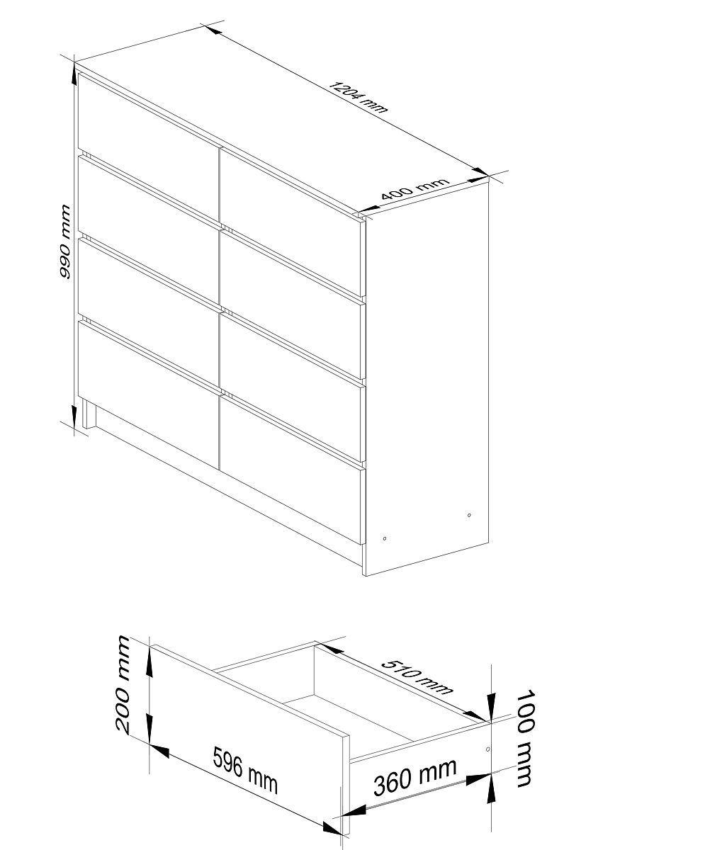 16 mm-es laminált lapból készült a Kronospan cégtől. A komód szélei ABS éllel vannak ellátva, amely növeli a komód ellenálló képességét a sérülésekkel szemben.