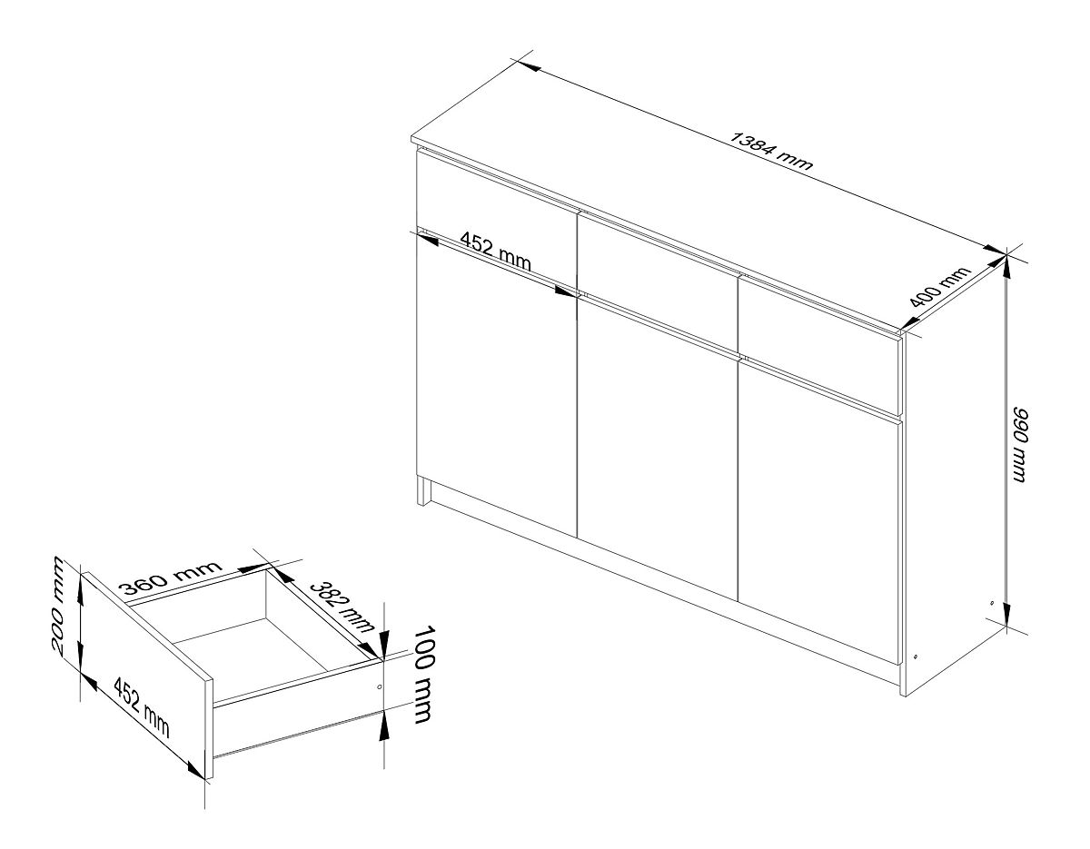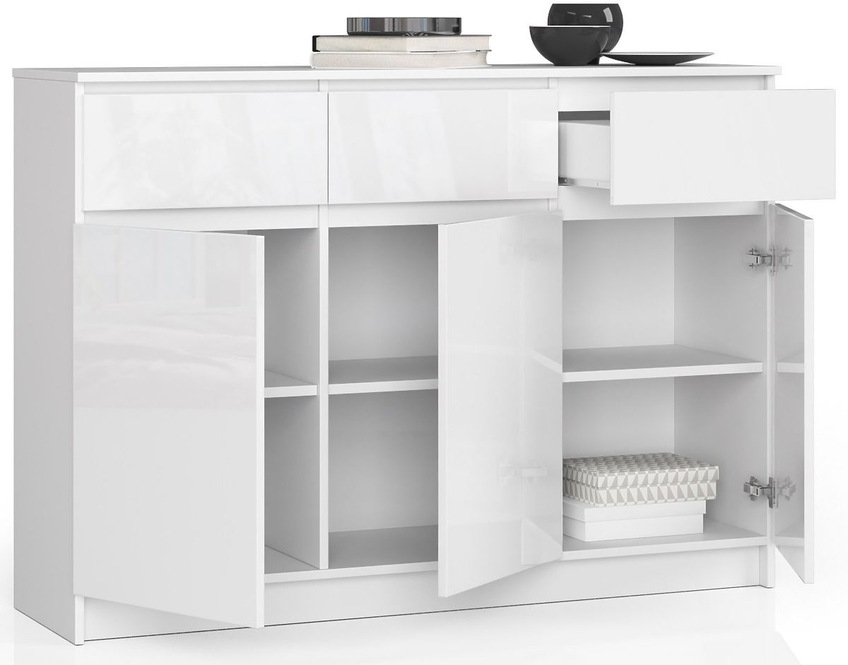 Fehér fényes komód, 138x99x40 cm méretben, 3 fiókkal és 3 ajtóval. .. többet