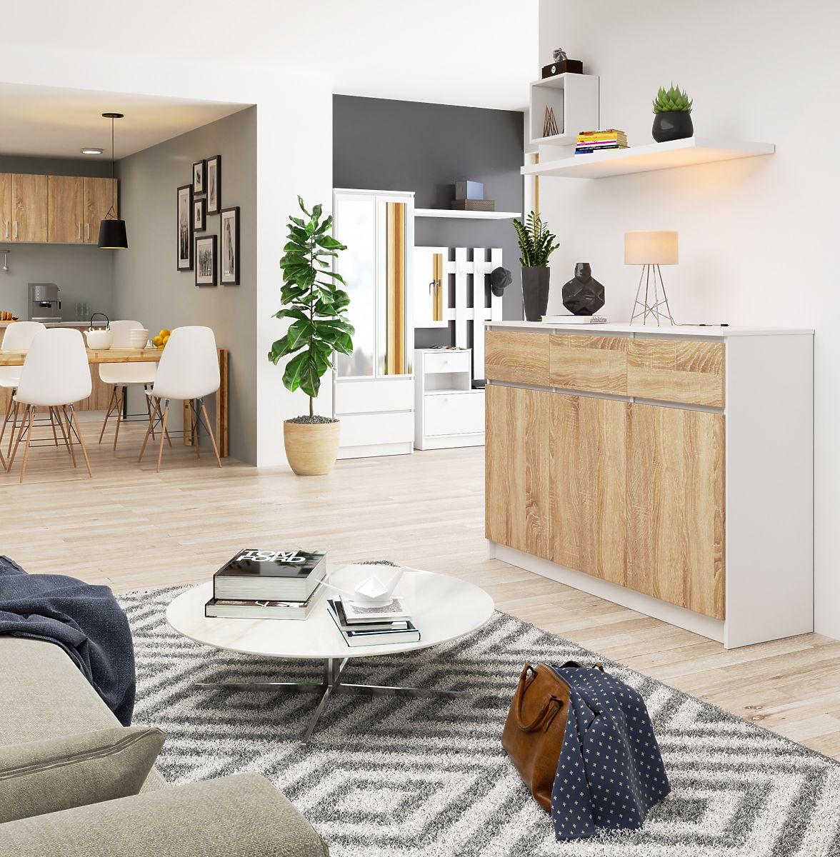 Fehér és Sonoma Tölgy színű, 3 ajtós, 3 fiókos komód. .. többet