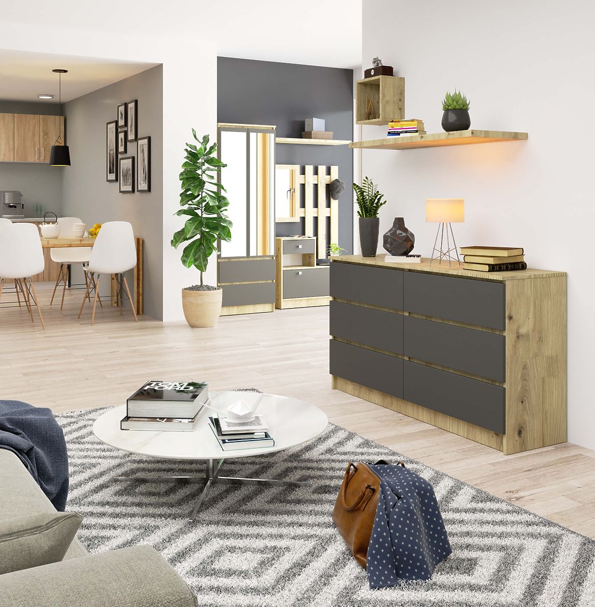 Kopásálló laminált komód 6 fiókkal, Artisan Tölgy és Grafit Szürke színben. .. többet