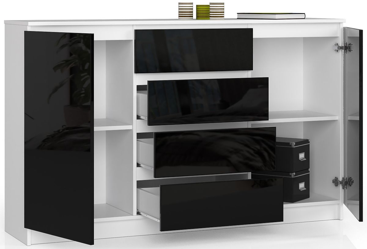 A komód teste 16 mm-es fehér félmatt laminált lapból készült, az előlapok 19 mm-es AKRIL dekor fekete magasfényű lapból készültek.