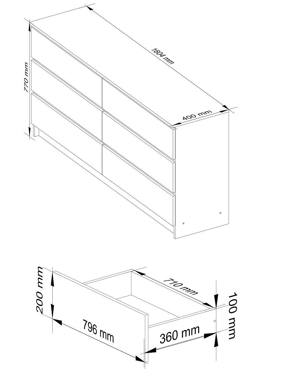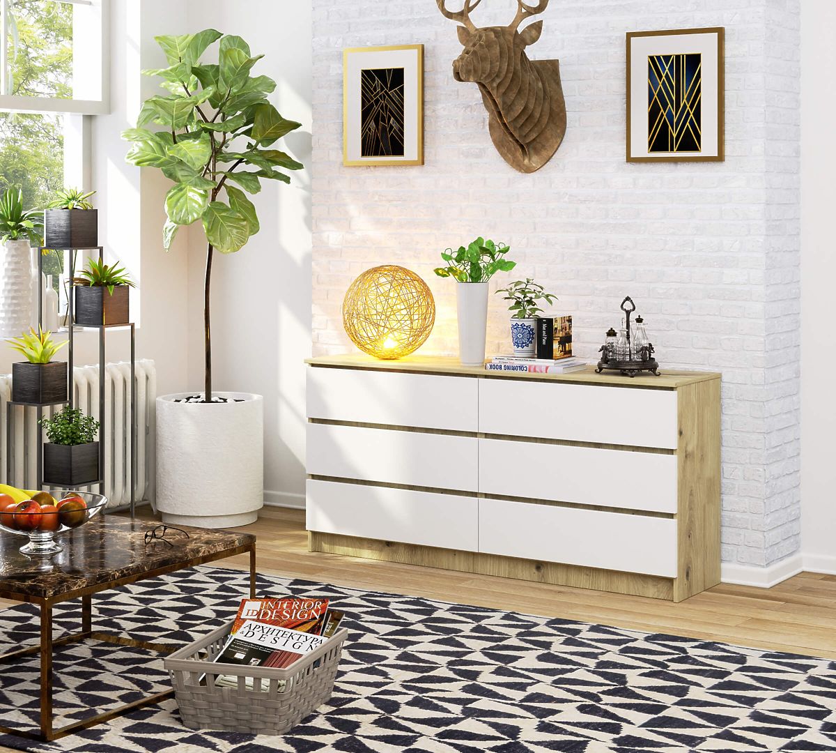 A 160 cm széles nappali komód hat tágas fiókkal rendelkezik. Az artisan tölgy és az örök fehér kombinációja olyan bútort eredményezett, amely tökéletesen illeszkedik számos különböző enteriőrbe. Használható hálószobában, nappaliban, diákszobában és irodában is. A komód jól illeszkedik a minimalista, modern, skandináv, retro és loft stílusú helyiségekhez. Ez az egyszerűség és elegancia tökéletes kombinációja, amelyet a legigényesebbek is értékelni fognak.