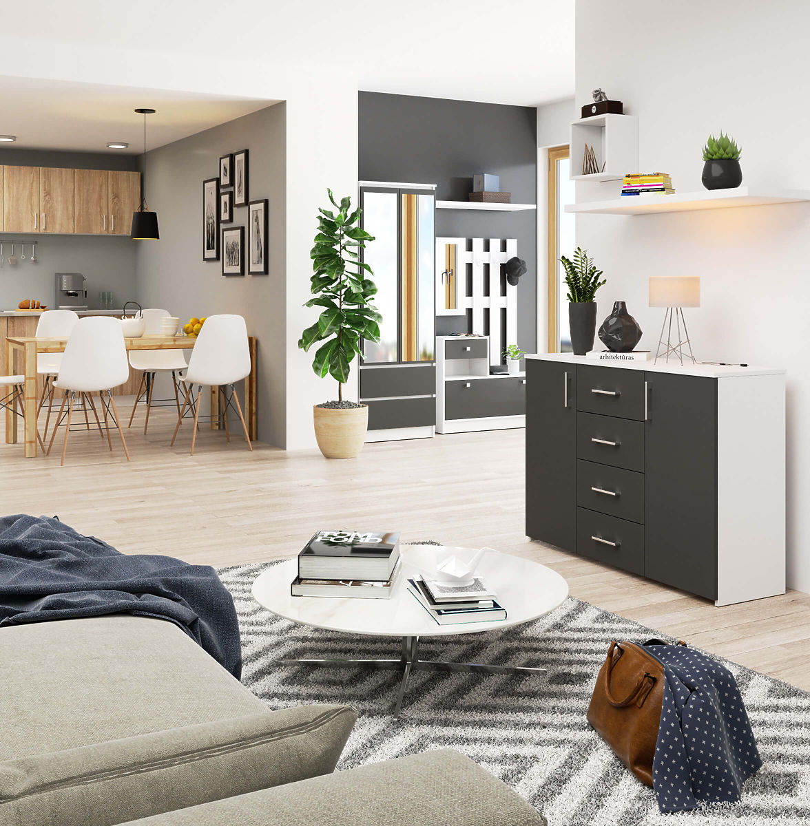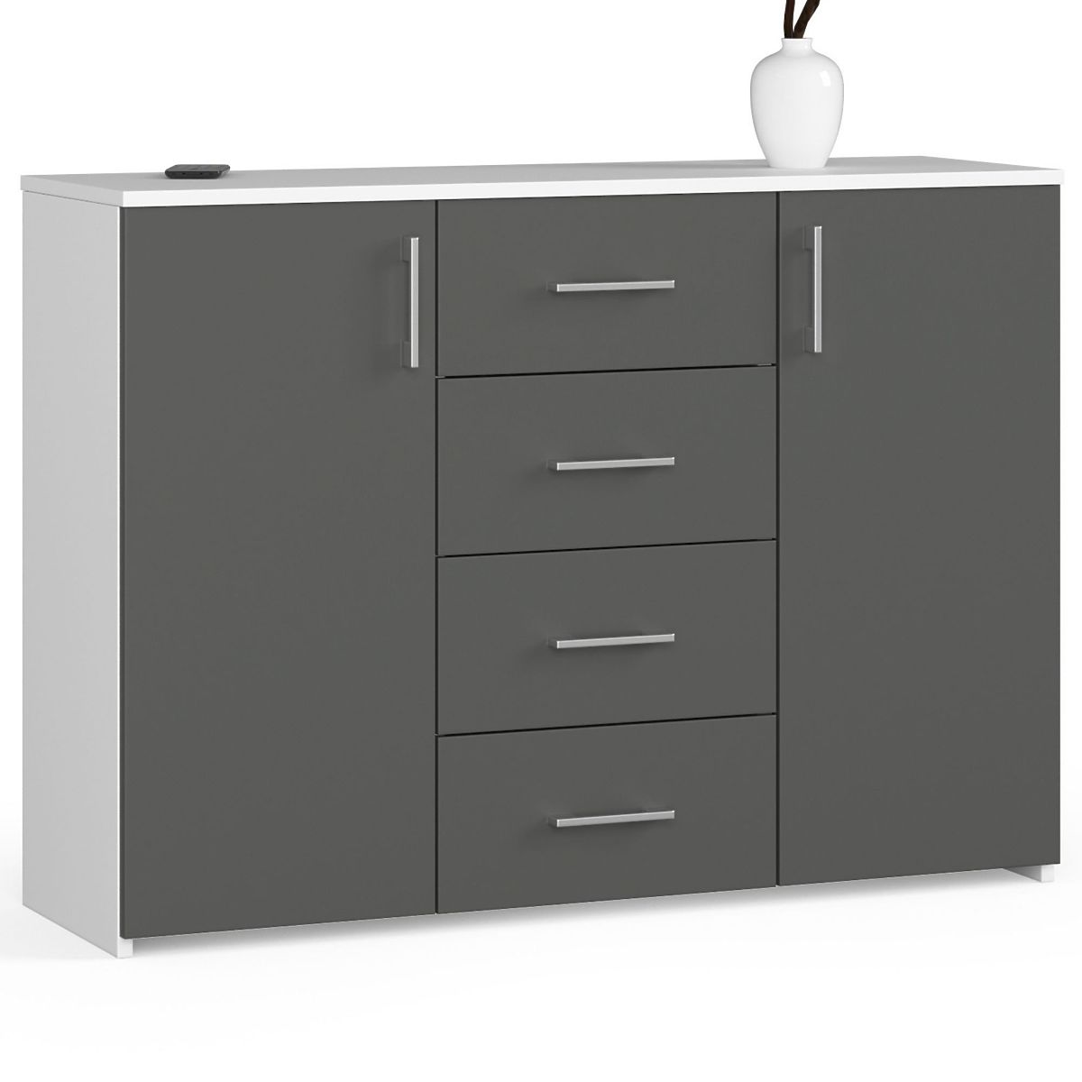 A fehér / grafit szürke komód nagy és tágas bútor, számos hasznos funkcióval. A komód mindkét oldalán ajtók találhatók, mögöttük 4 mély polccal. A bútor középső része is nagyon funkcionálisan van kialakítva, mivel 4 mély fiókkal van felszerelve. A komód tehát rengeteg tárolóhelyet kínál.