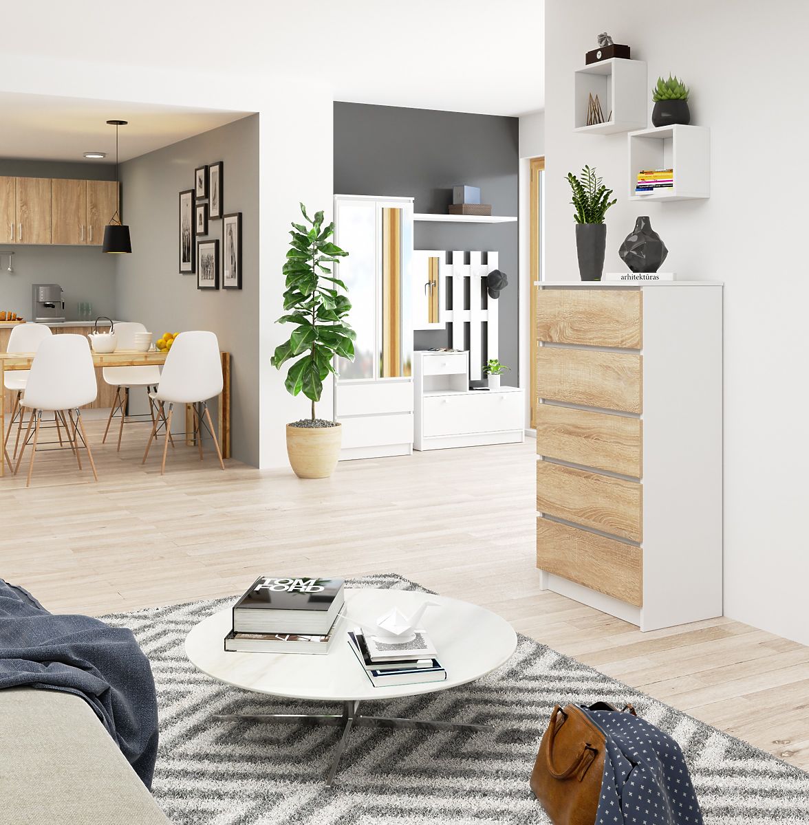 Kopásálló laminált komód 5 fiókkal, fehér és Sonoma tölgy színben. .. többet