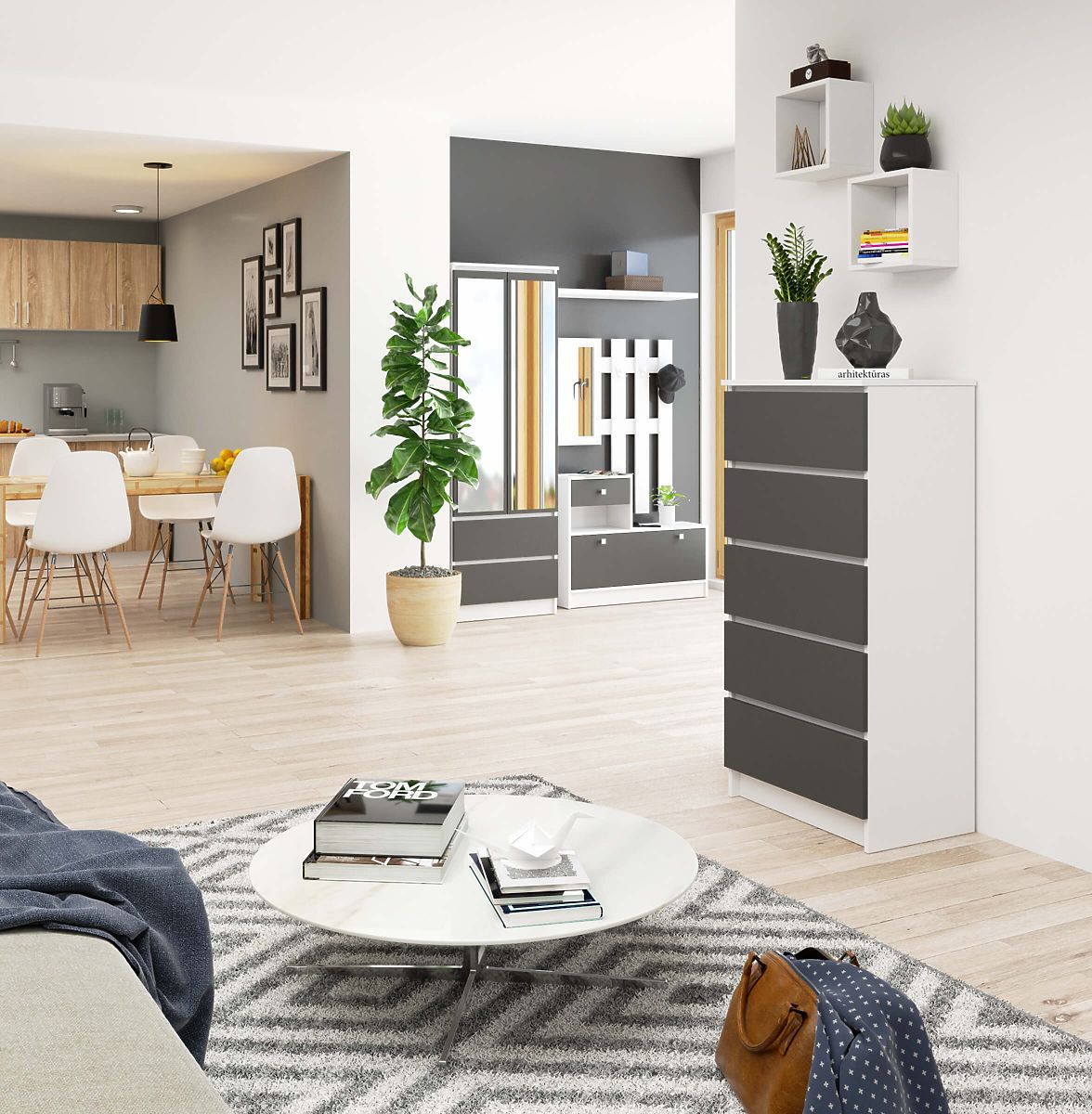 Kopásálló laminált komód 5 fiókkal, fehér és szürke színben. .. többet