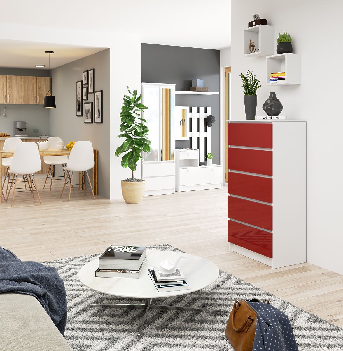 Az érdekes módon tervezett bútor különösen a fiatalokat szólítja meg, akik nem félnek az intenzív színektől és érdekes ötleteik vannak a berendezésre. Garantáljuk a komód és a sorozat többi darabjának vonzó árát.