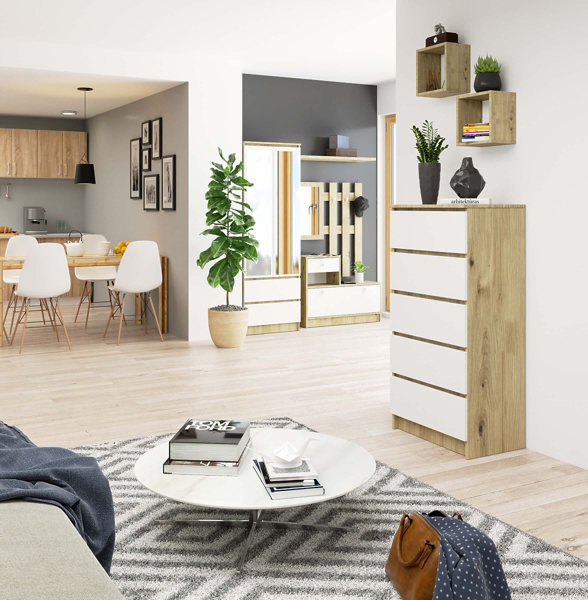 Önállóan összeszerelhető, 5 fiókos komód Tölgy Artisan és Fehér színben. .. többet