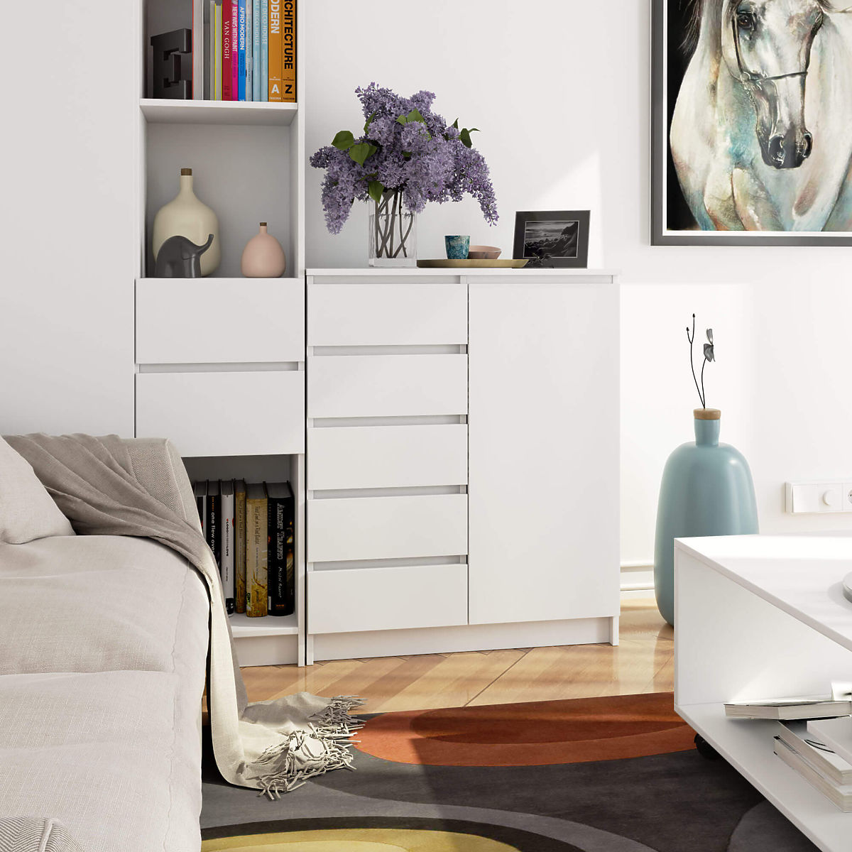 A K80 cm 1D 5F komód szabadon kombinálható más bútorokkal, mint például kisebb és nagyobb szekrények, íróasztalok vagy polcok, amelyek szintén a kínálat részei. Ez egy kiváló minőségű, praktikus bútor kedvező áron. Segítségével világos, szemnek tetsző teret hozhatunk létre, amelyet egyszerű, de elegáns bútorokkal rendezhetünk be, amelyek tökéletesen illeszkednek minden modern berendezésű belső térbe.