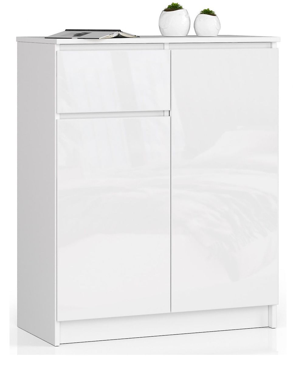 A kis fehér komód praktikus fiókkal és két zárt szekrénnyel rendelkezik - mindegyikben két polc található. A bútorok szilárd szerkezetükkel és gondos kidolgozásukkal tűnnek ki. A bemutatott ajánlat szemet gyönyörködtető és a funkcionalitás szempontjából a legigényesebb vásárlók elvárásainak is megfelel. A K 80 cm-es komód a fehér test és a magas fényű elülső felületek kombinációja azonos színben. Az ízléses bútorok kétségtelenül nagyszerűen mutatnak számos skandináv, minimalista vagy modern stílusú belső térben.