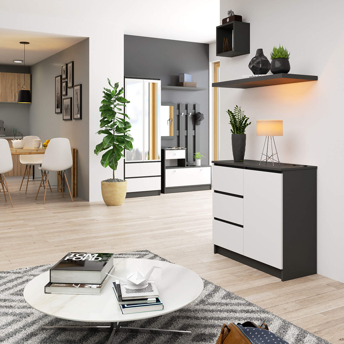 A kis komód egy olyan berendezési elem, amely minden helyiségben hasznos lehet. A modern színek, a masszív szerkezet és a gondos kidolgozás egy olyan szekrényt eredményeztek, amely például az előszobában, nappaliban vagy gyerekszobában, de akár a hálószobában is megállja a helyét. Irodai környezetben is használható, ahol számos dokumentum és egyéb irodai eszköz tárolását teszi lehetővé. A komód egy ajtóból (belül két polccal) és 3 fiókból áll. A bútor grafit szürke és fehér színeket kombinál.