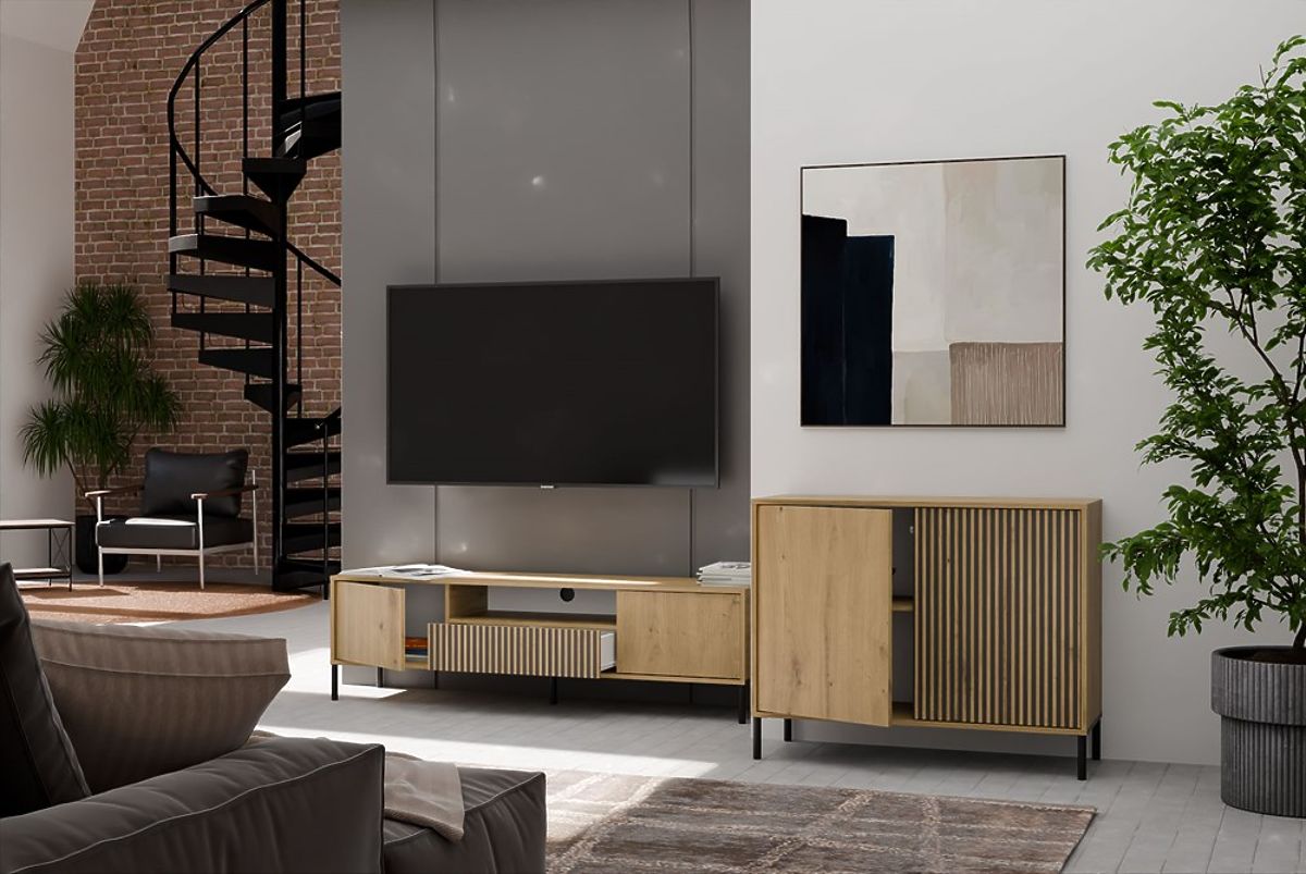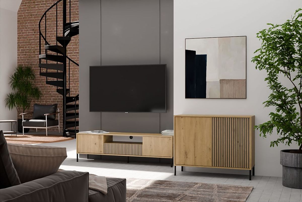 A KAMARO 2D SLIM/SIMA TÖLGY ARTISAN komód az esztétika és a funkcionalitás kombinációja, amely tökéletesen illik a nappaliba, vendégszobába, hálószobába vagy dolgozószobába. Az egyik ajtó lamellás elülső része modern és egyedi megjelenést kölcsönöz a bútornak, amely tökéletesen illeszkedik a modern belső terekhez.