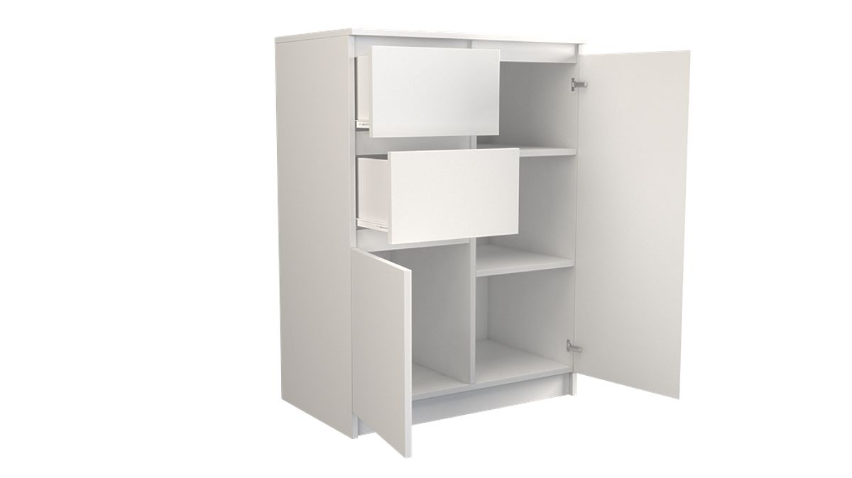 A komód belseje polcokból és két fiókból áll, amelyek segítenek a dolgok elrendezésében. Könnyebb lesz megtalálni, amit keres.