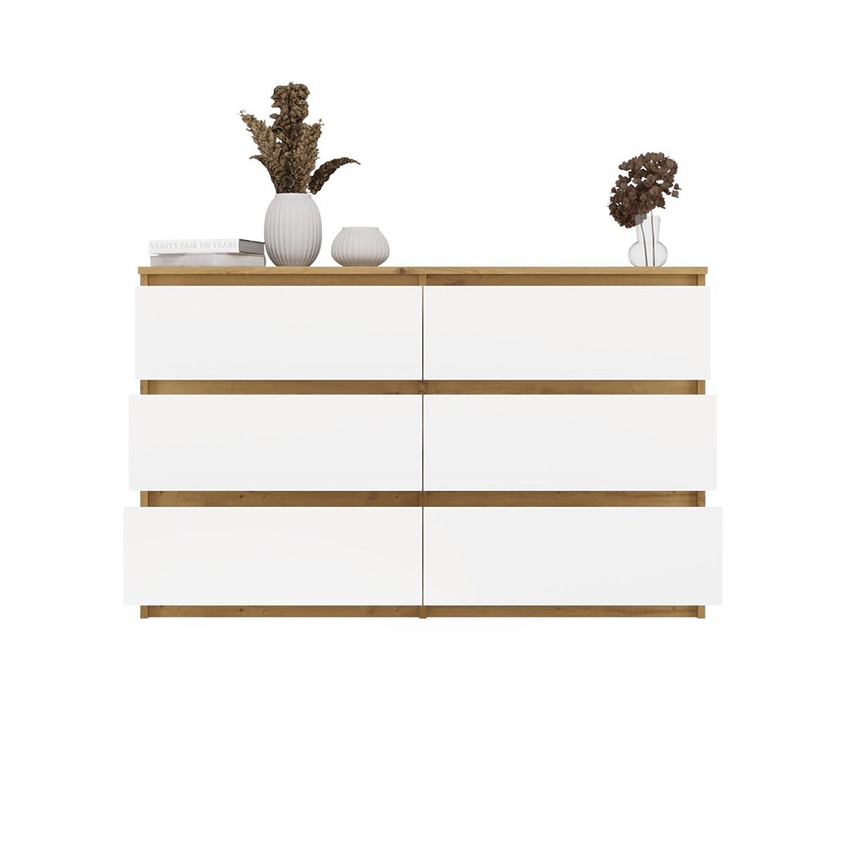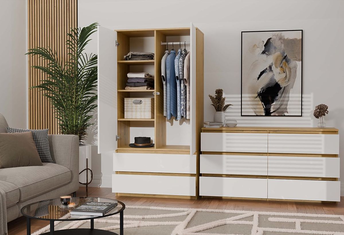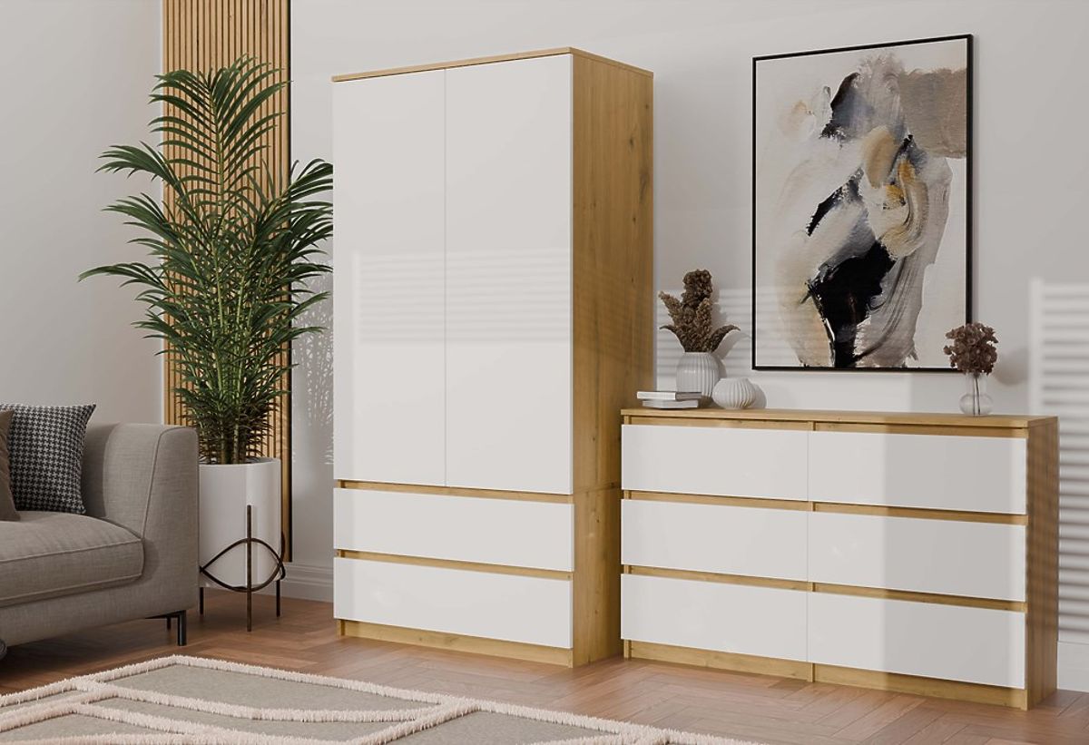 Az Artisan Tölgy dekor test és a minimalista fehér előlapok kombinációja friss és elegáns megjelenést kölcsönöz a komódnak. Ez a dizájn remekül illik világos, skandináv belső terekbe, valamint klasszikus vagy modern elrendezésekbe.