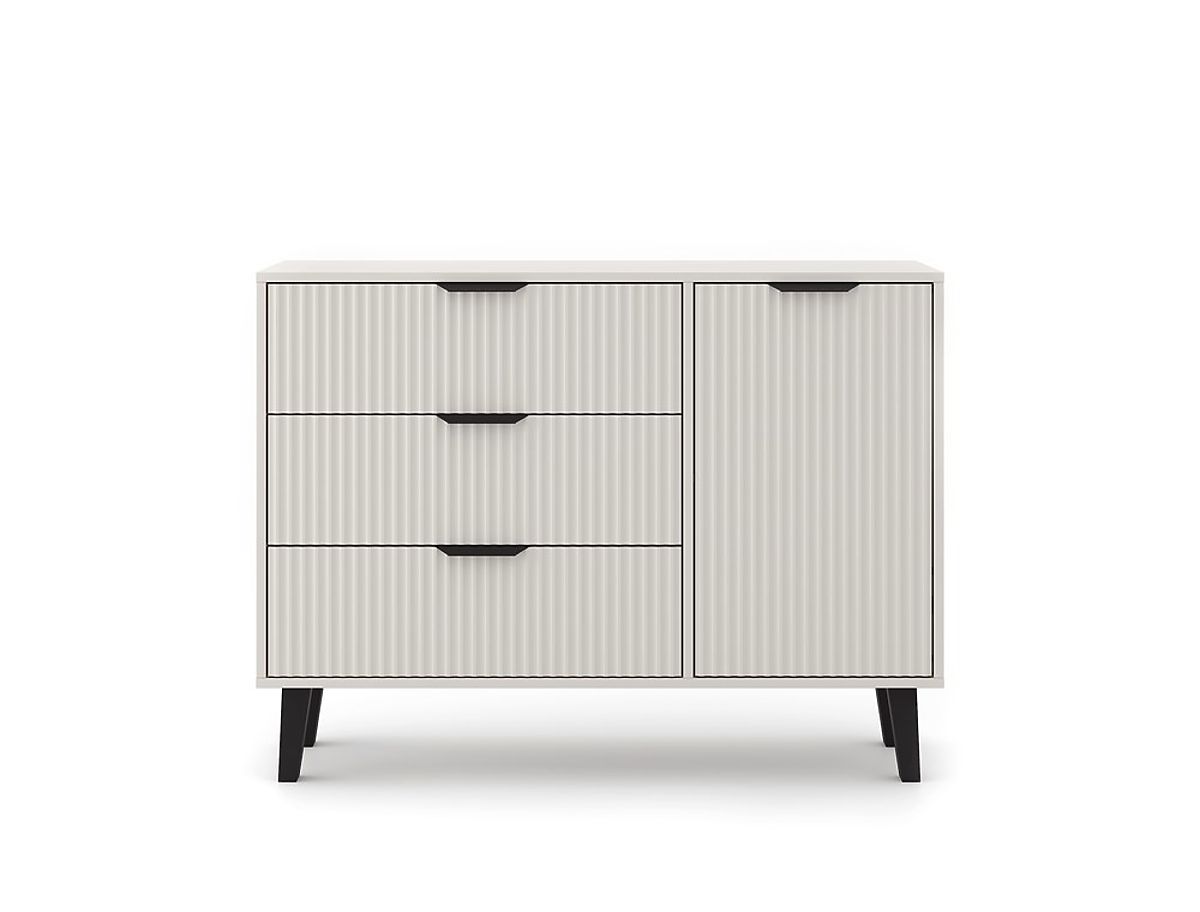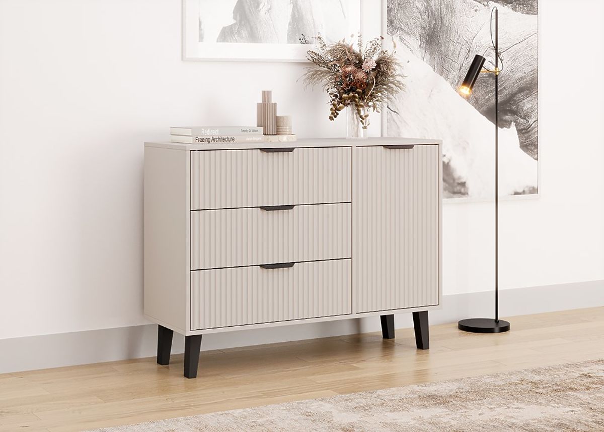 A SCANDI 1D3S SLIM komód a divatos design és a funkcionalitás kombinációja, ideális skandináv és modern stílusú belső terekhez. Kompakt méretei és esztétikus kivitelezése miatt alkalmas nappaliba, hálószobába és előszobába is.